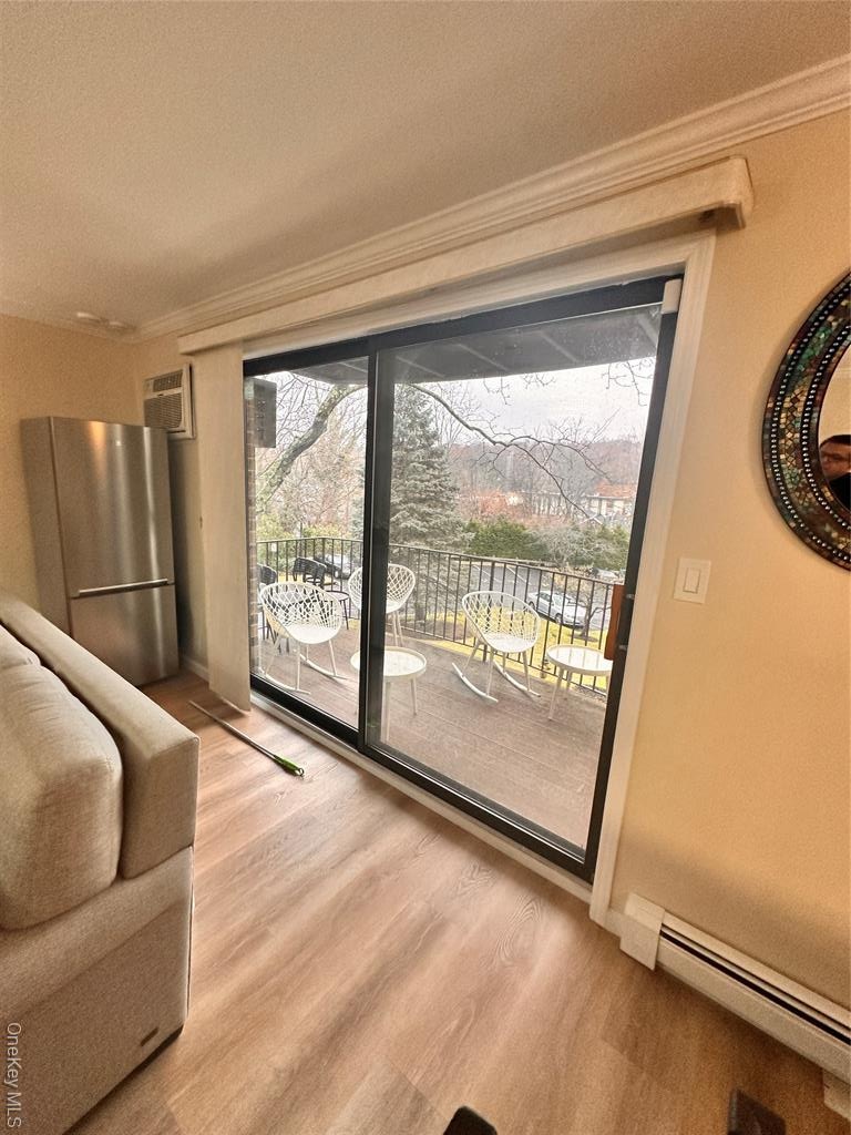 - Doorway to outside with crown molding, a baseboard radiator, wood finished floors, plenty of natural light, and a wall unit AC