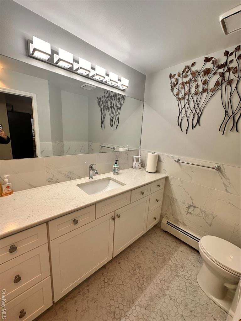 - Bathroom with tile walls, vanity, baseboard heating, light tile patterned floors, and a wainscoted wall