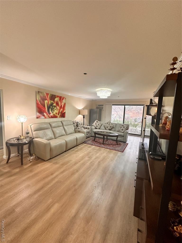 - Living room featuring light wood-style flooring and ornamental molding