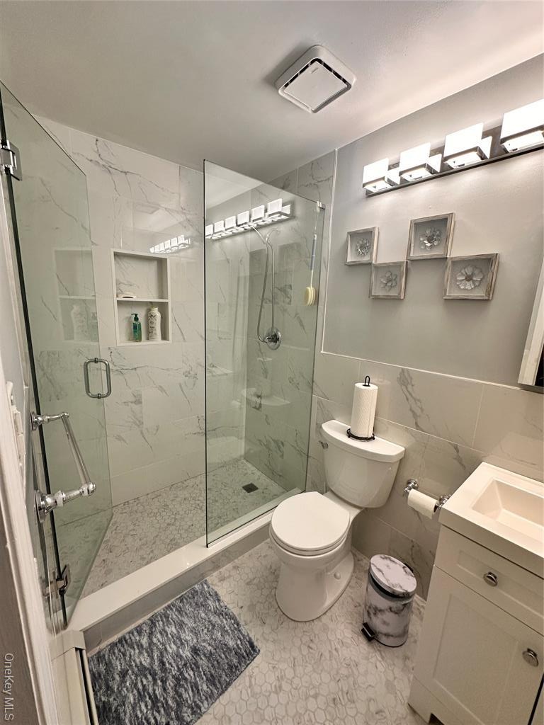 - Full bathroom featuring tile walls, a marble finish shower, vanity, and tile patterned flooring
