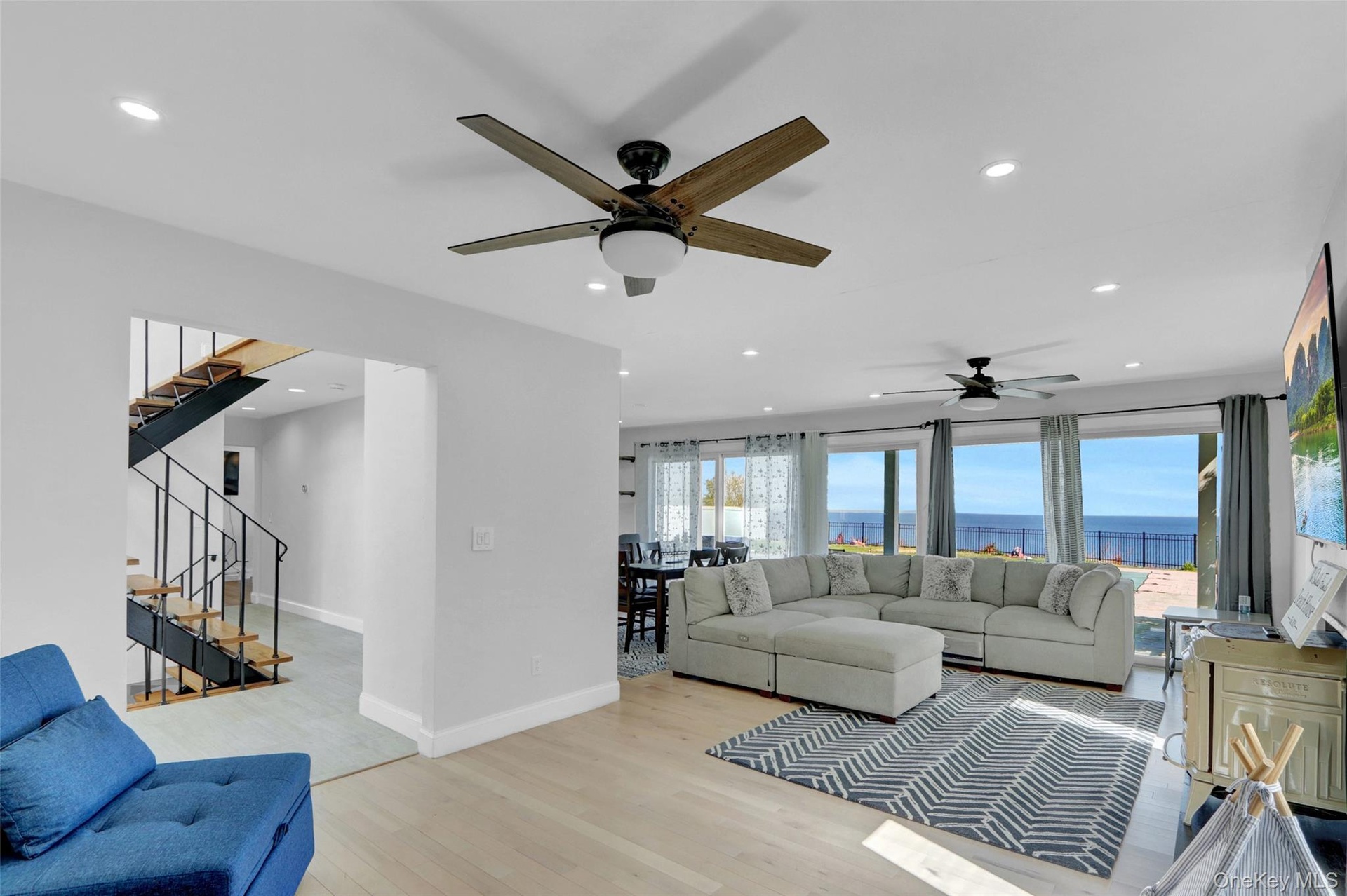 - Living room with recessed lighting, light wood-style flooring, a ceiling fan, and a water view