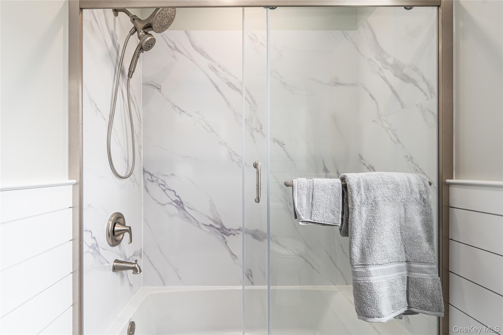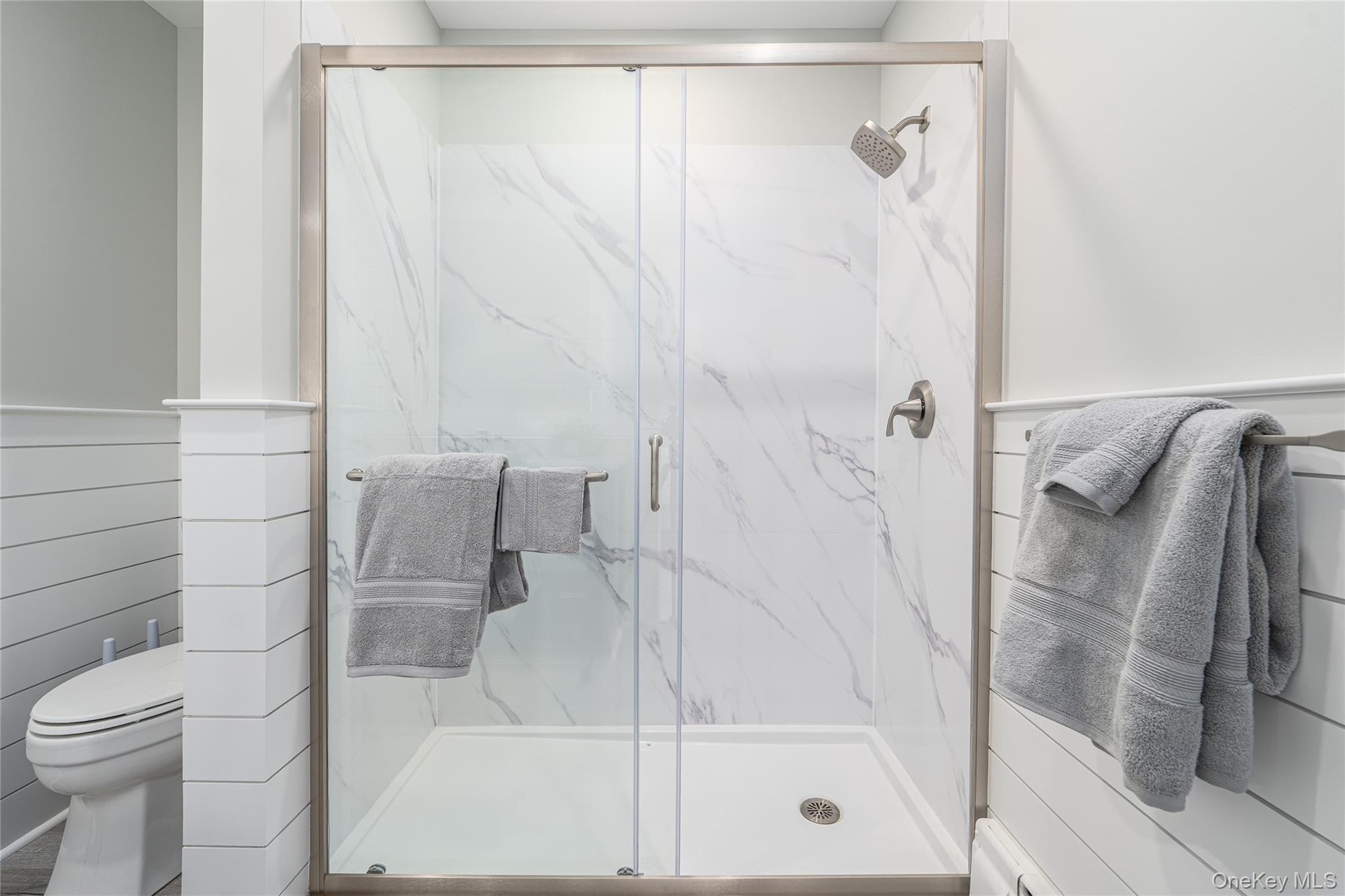 - Bathroom with recessed lighting, vanity, toilet, a marble finish shower, and wood finished floors