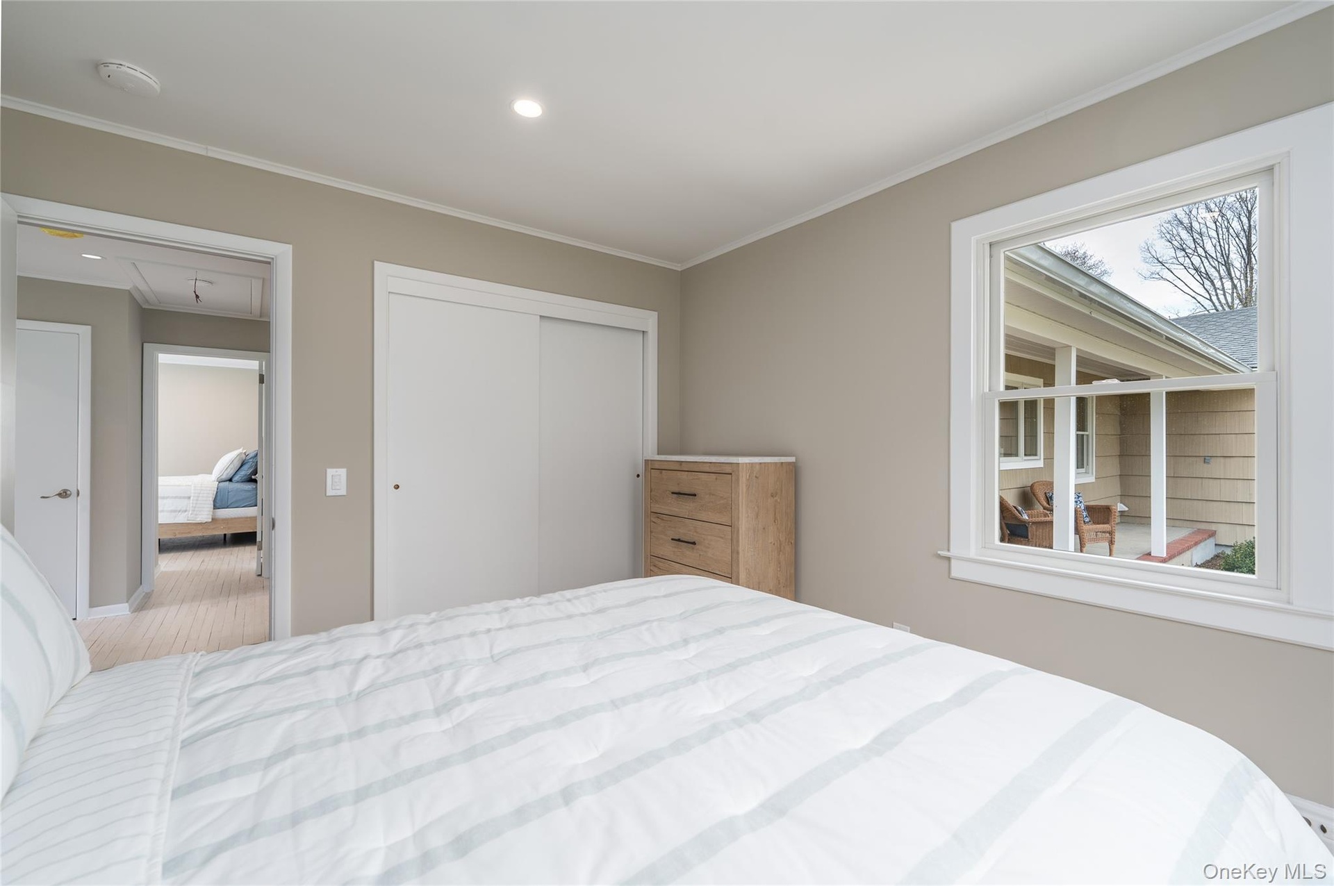 - Bedroom with light wood-type flooring, crown molding, recessed lighting, and a closet