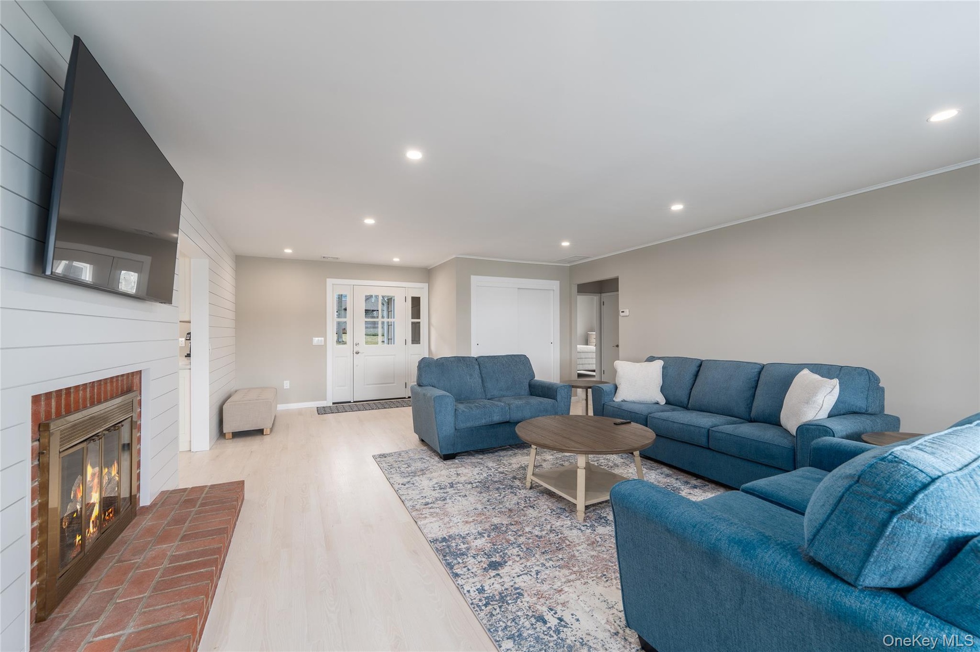- Living room with recessed lighting, light wood finished floors, and a brick fireplace