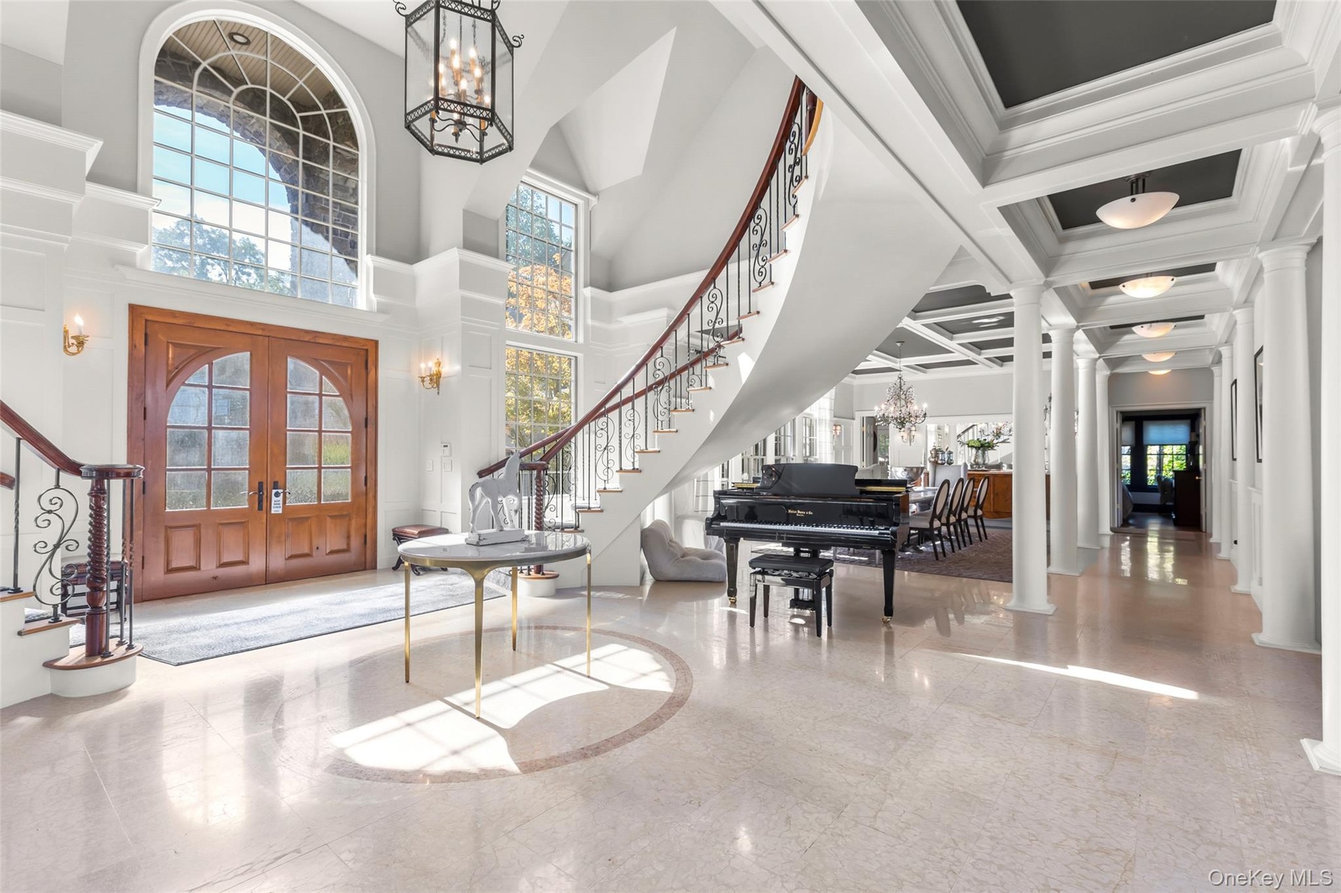 - Entryway featuring a towering ceiling, decorative columns, stairway, and a chandelier