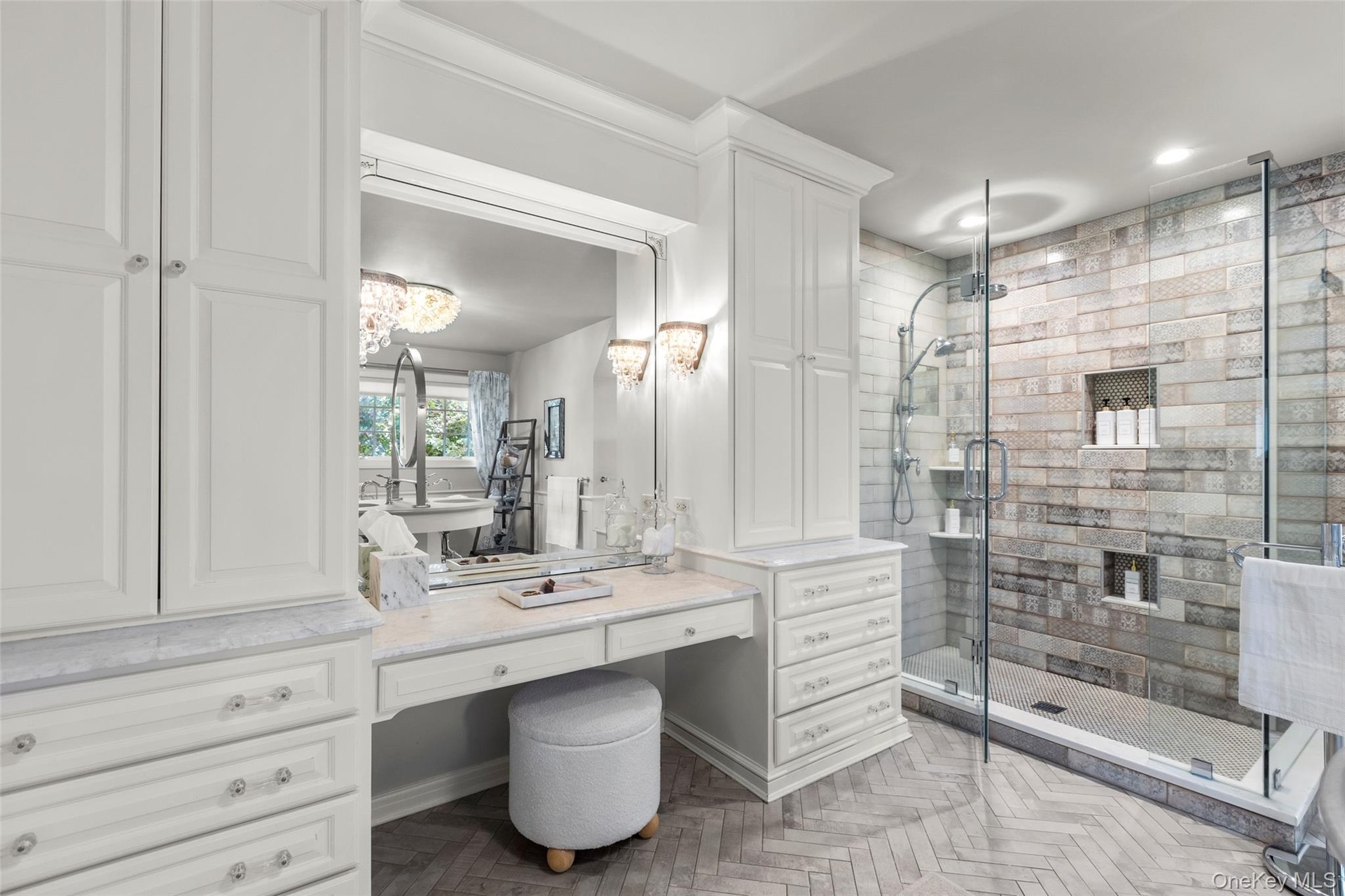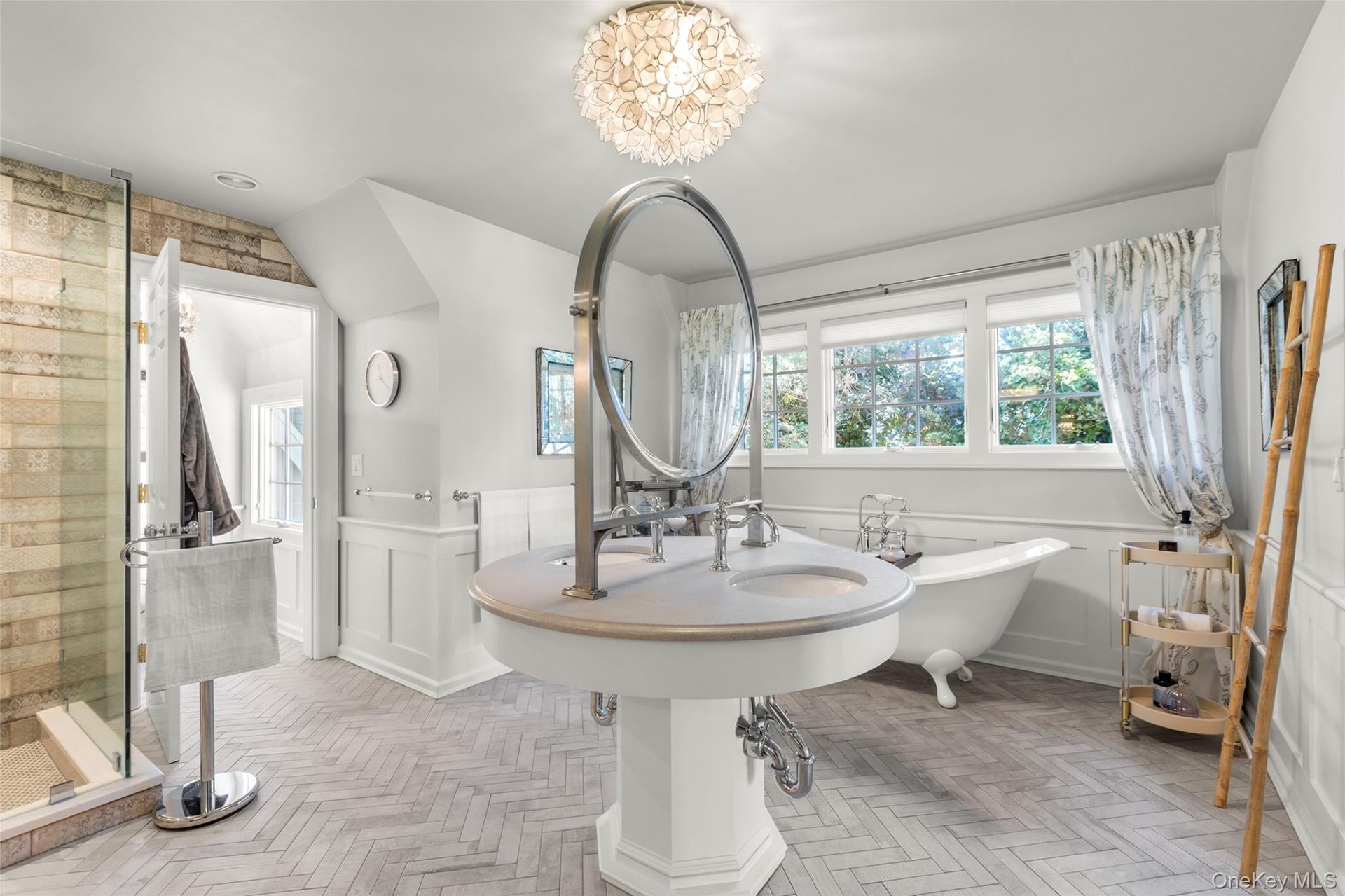 - Full bath featuring a stall shower, wainscoting, a soaking tub, a decorative wall, and a chandelier