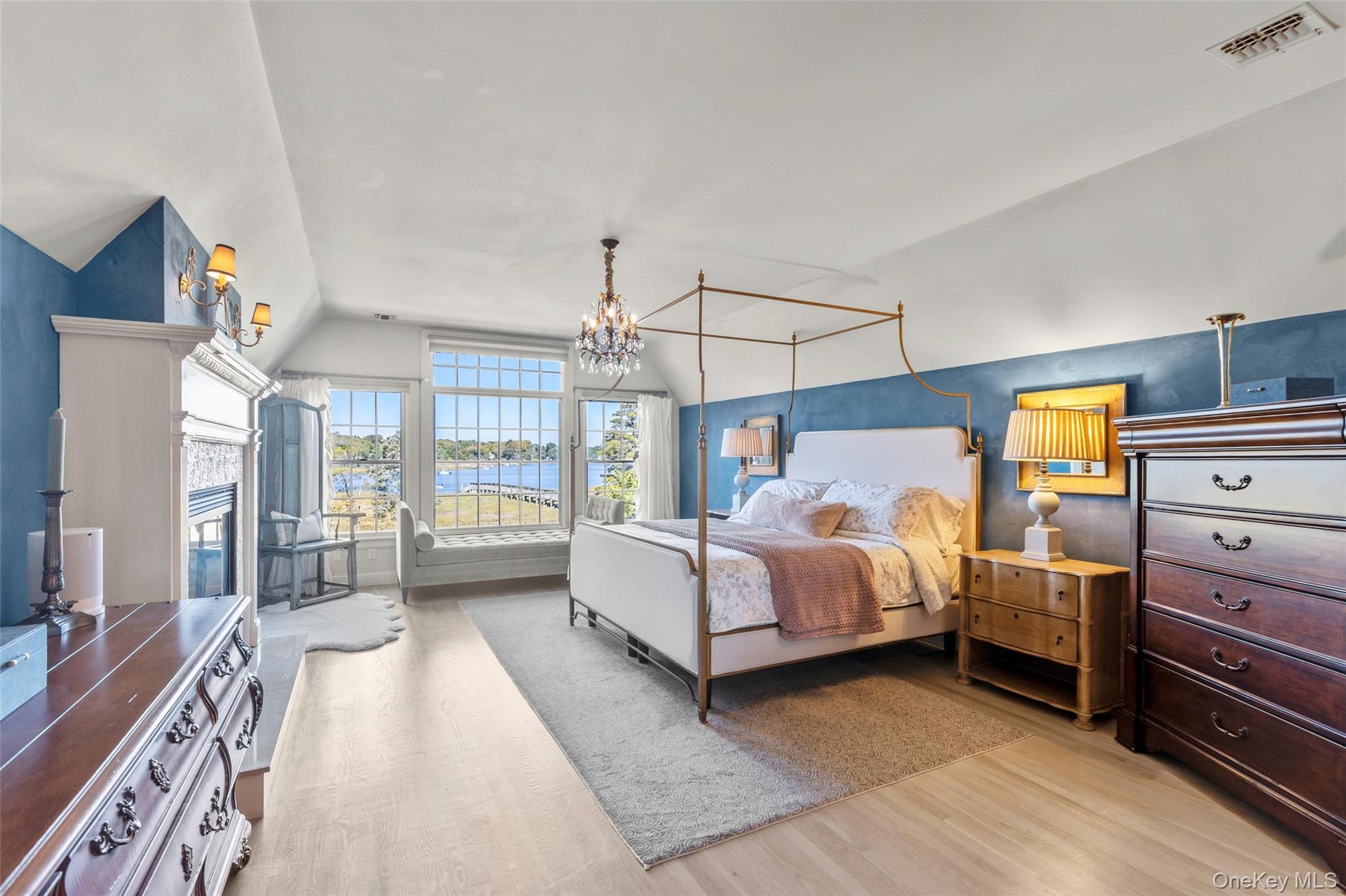 - Bedroom with lofted ceiling, light wood-style flooring, a fireplace, a chandelier, and a water view