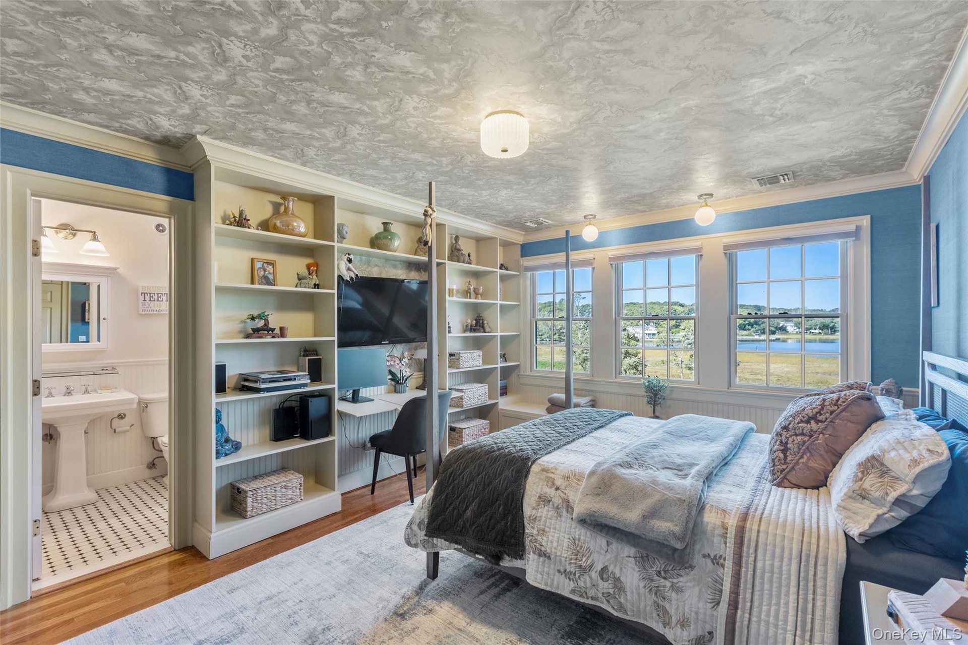 - Bedroom featuring crown molding, multiple windows, wood finished floors, a wainscoted wall, and recessed lighting