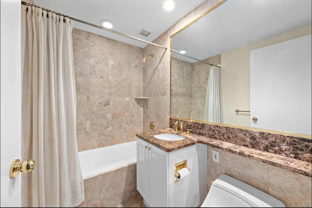 The spacious bedroom includes generous closet space and large windows, while the spa-like bathroom is finished in elegant marble.