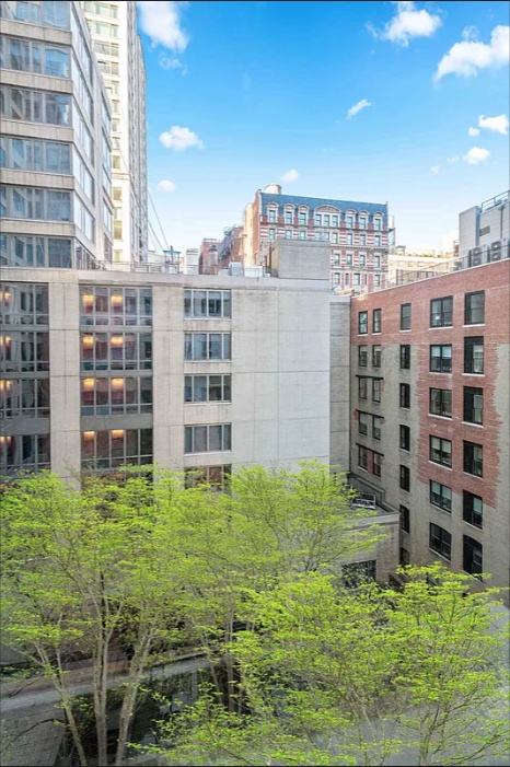 Northeast exposure with serene views of the private building courtyard and abundant morning light