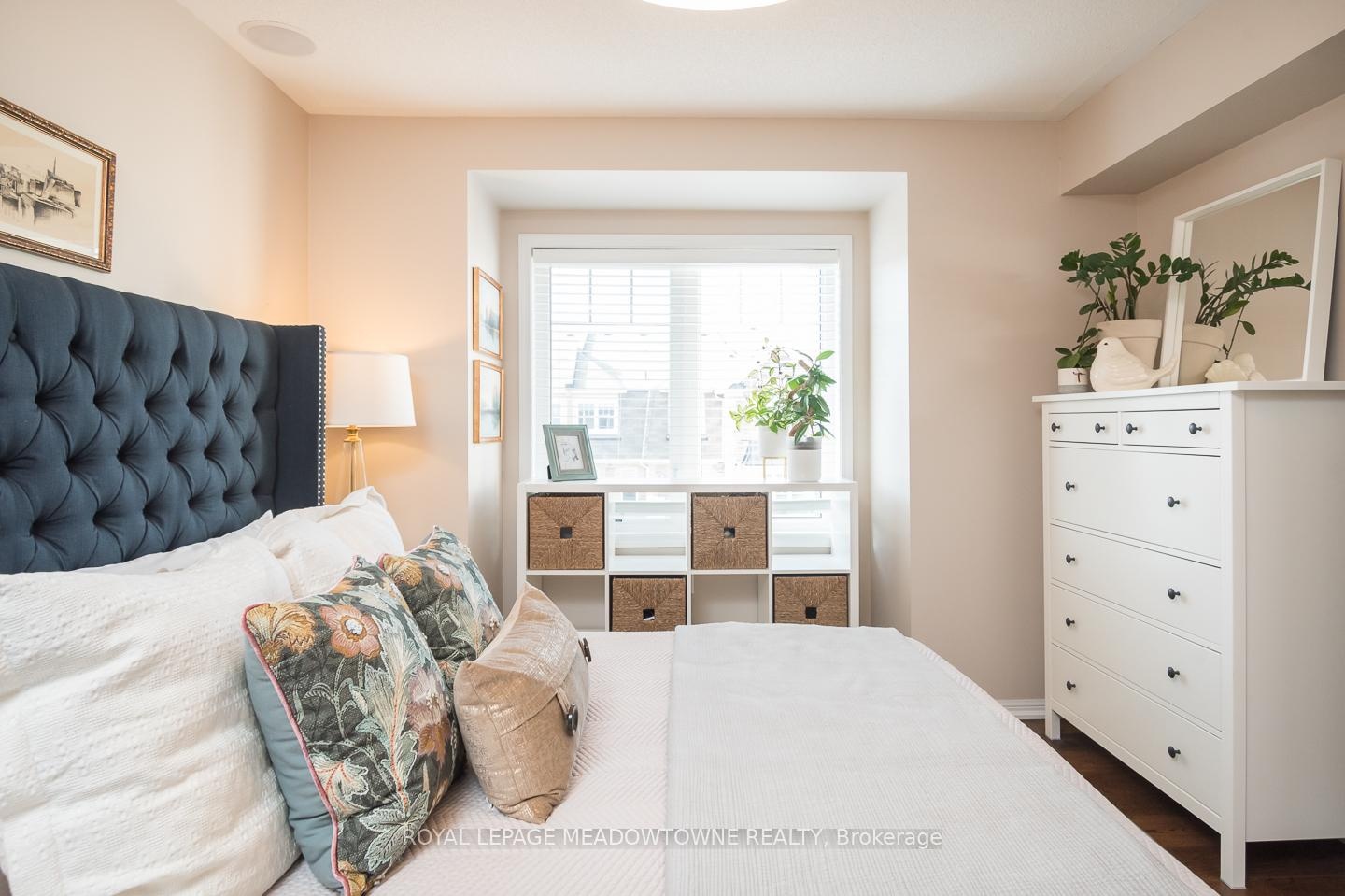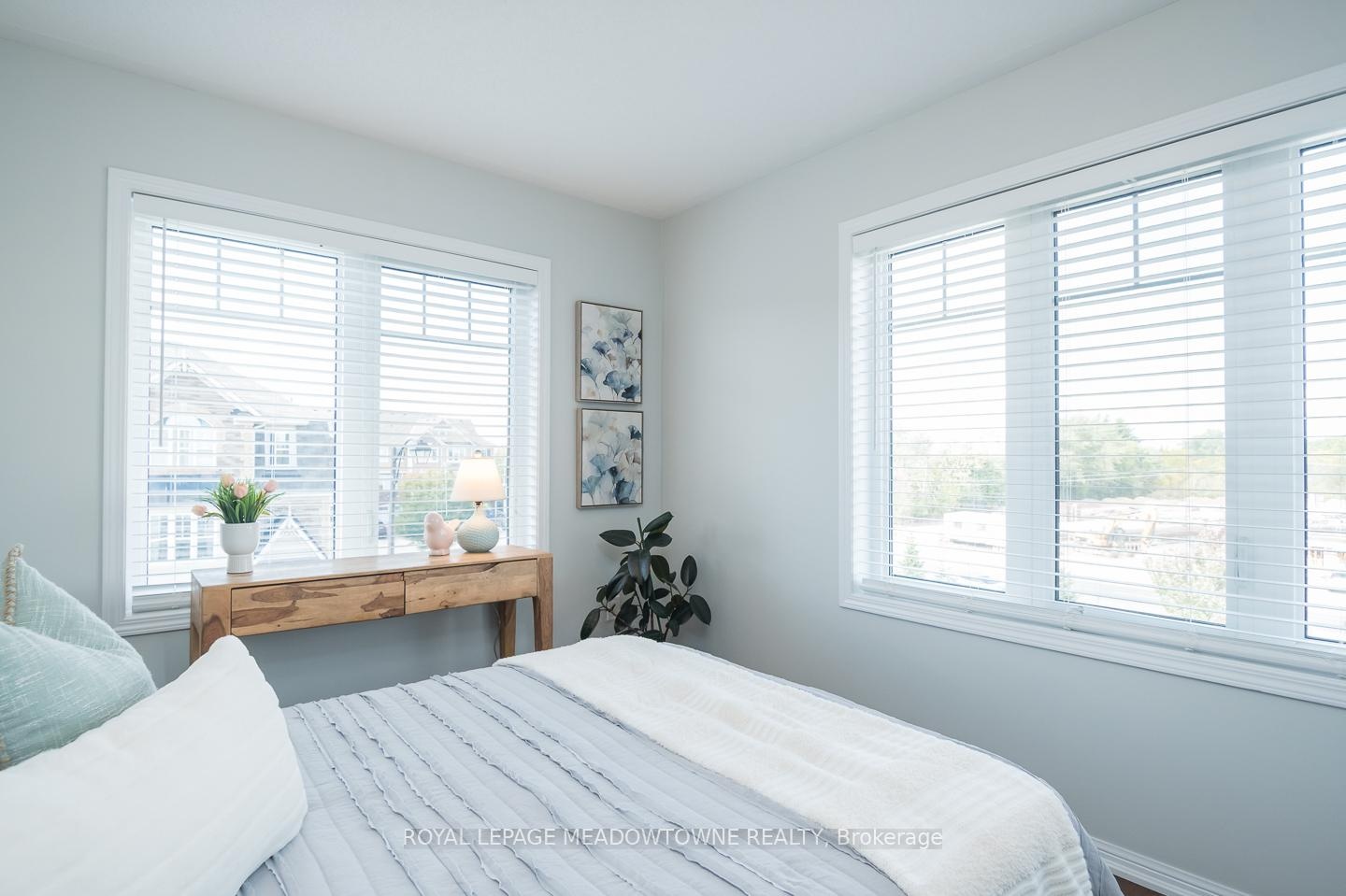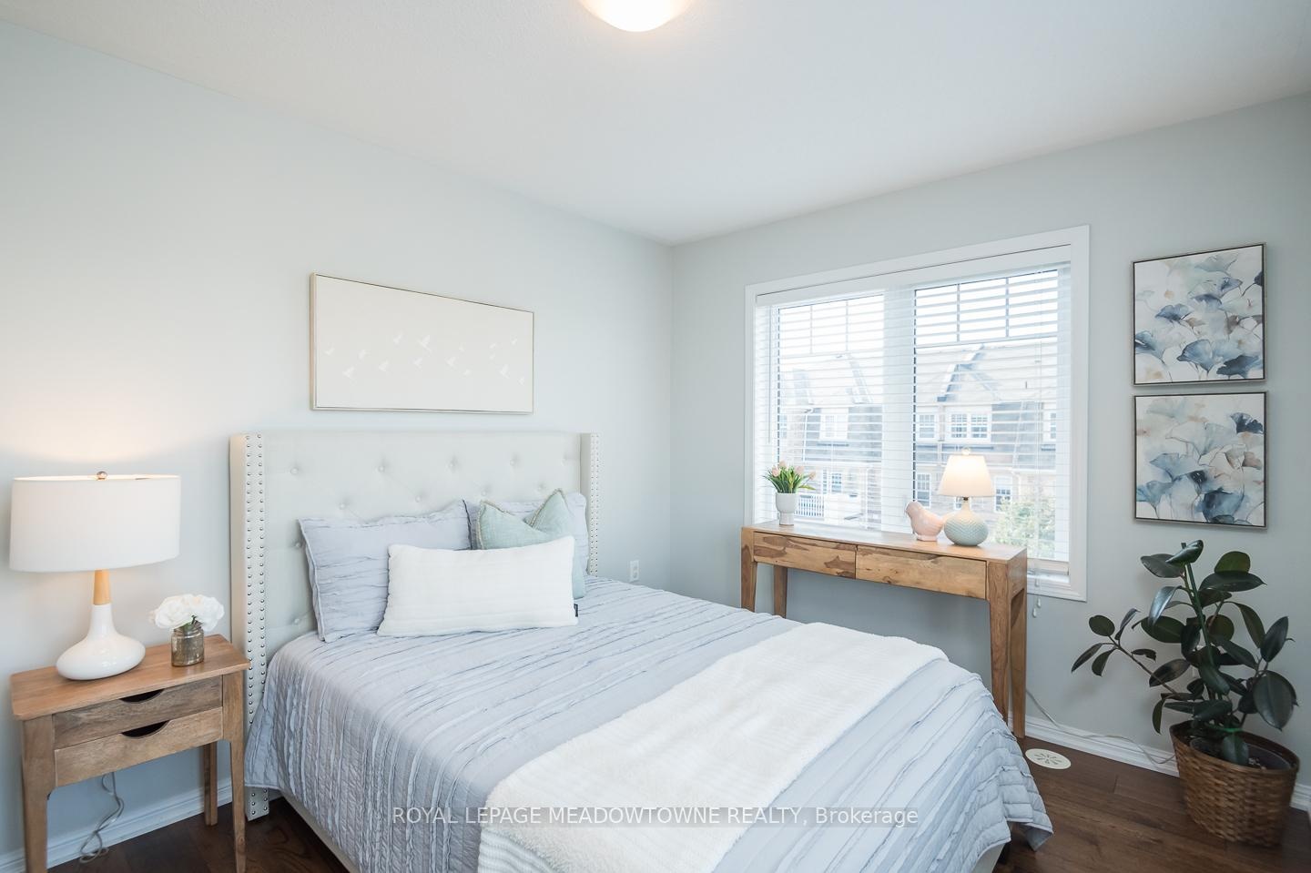Welcome to this stunning freehold Sutton Corner model townhome located in Milton's sought-after Willmott neighbourhood. This bright and spacious 3-storey corner unit offers 3 bedrooms, 2.5 bathrooms, and thoughtful upgrades throughout. Ideally situated within walking distance to parks, schools, and everyday amenities, plus quick access to the 401, 407, and GO station, its perfect for families and commuters alike. The home features a welcoming covered porch, a large balcony, parking for 2 (garage + driveway), and convenient interior garage access. Inside, enjoy hardwood flooring throughout, pot lights, in-ceiling speakers, and a cozy gas fireplace in the open-concept living and dining area. The white kitchen shines with quartz countertops, tile backsplash, under-cabinet lighting, peninsula seating, and direct access to the balcony. Upstairs, you'll find 3 generous bedrooms including a primary retreat with a walk-in closet and 3-piece ensuite, plus a 4-piece main bath. With a main floor den, laundry, and stylish stone counters in every bathroom, this home blends comfort and function in an unbeatable location.