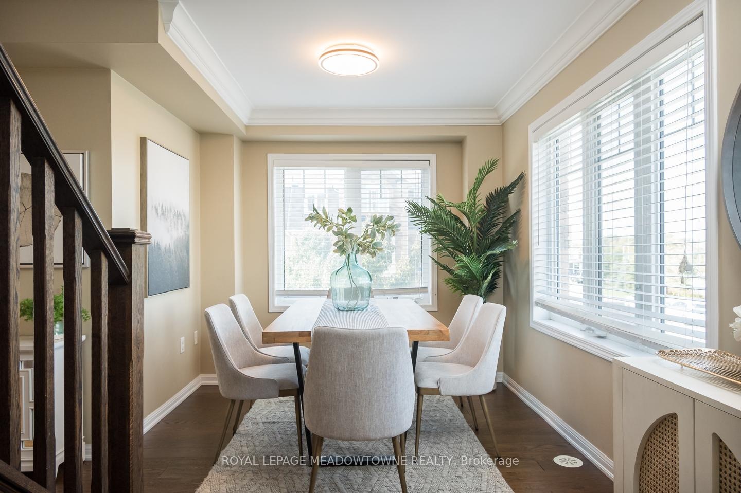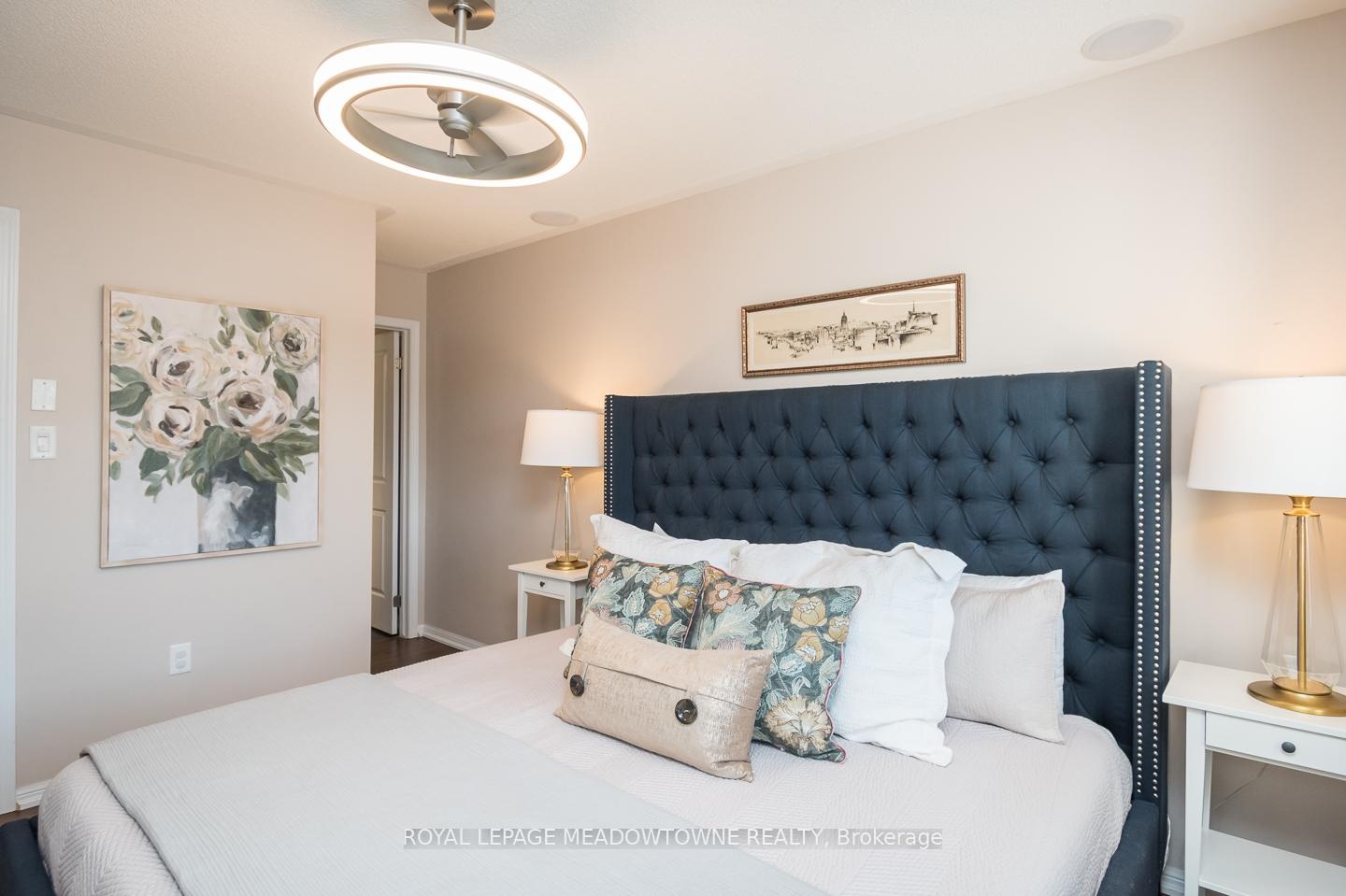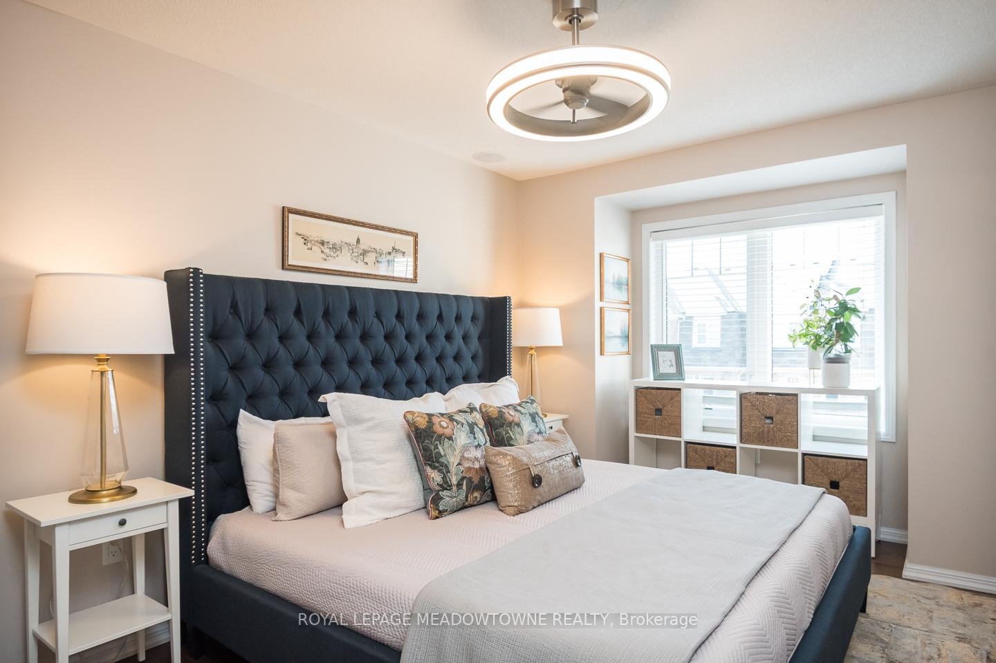 Welcome to this stunning freehold Sutton Corner model townhome located in Milton's sought-after Willmott neighbourhood. This bright and spacious 3-storey corner unit offers 3 bedrooms, 2.5 bathrooms, and thoughtful upgrades throughout. Ideally situated within walking distance to parks, schools, and everyday amenities, plus quick access to the 401, 407, and GO station, its perfect for families and commuters alike. The home features a welcoming covered porch, a large balcony, parking for 2 (garage + driveway), and convenient interior garage access. Inside, enjoy hardwood flooring throughout, pot lights, in-ceiling speakers, and a cozy gas fireplace in the open-concept living and dining area. The white kitchen shines with quartz countertops, tile backsplash, under-cabinet lighting, peninsula seating, and direct access to the balcony. Upstairs, you'll find 3 generous bedrooms including a primary retreat with a walk-in closet and 3-piece ensuite, plus a 4-piece main bath. With a main floor den, laundry, and stylish stone counters in every bathroom, this home blends comfort and function in an unbeatable location.