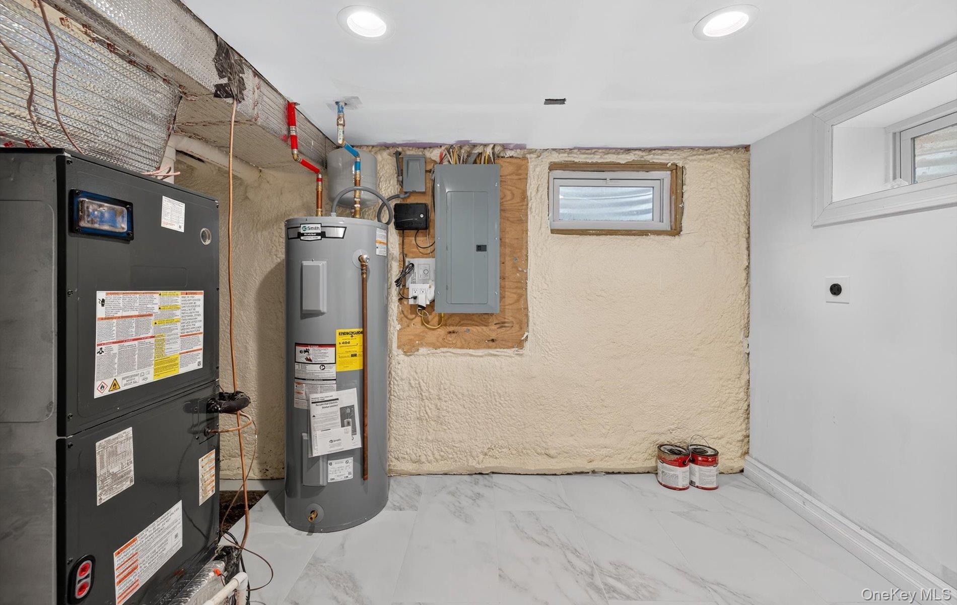 - Utility room featuring electric panel, water heater, and heating unit