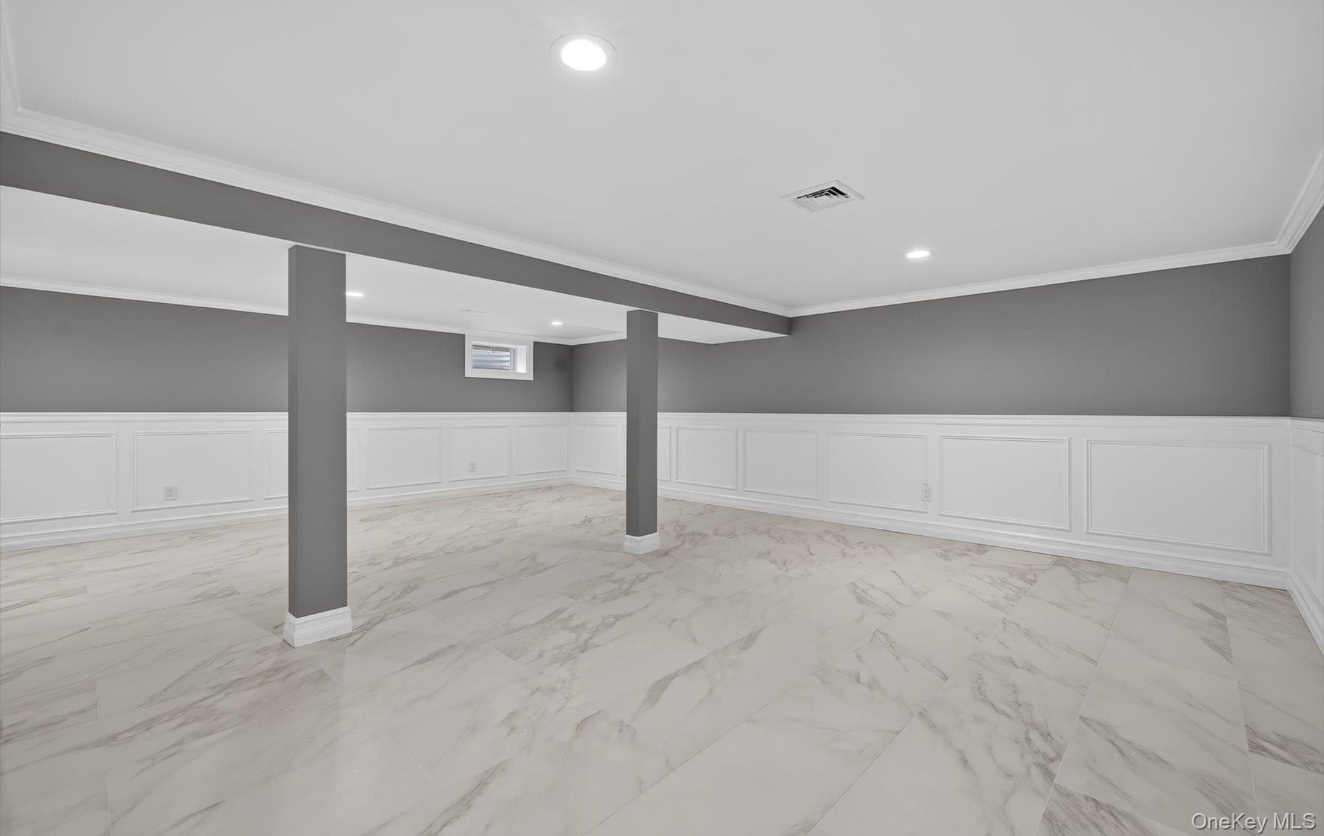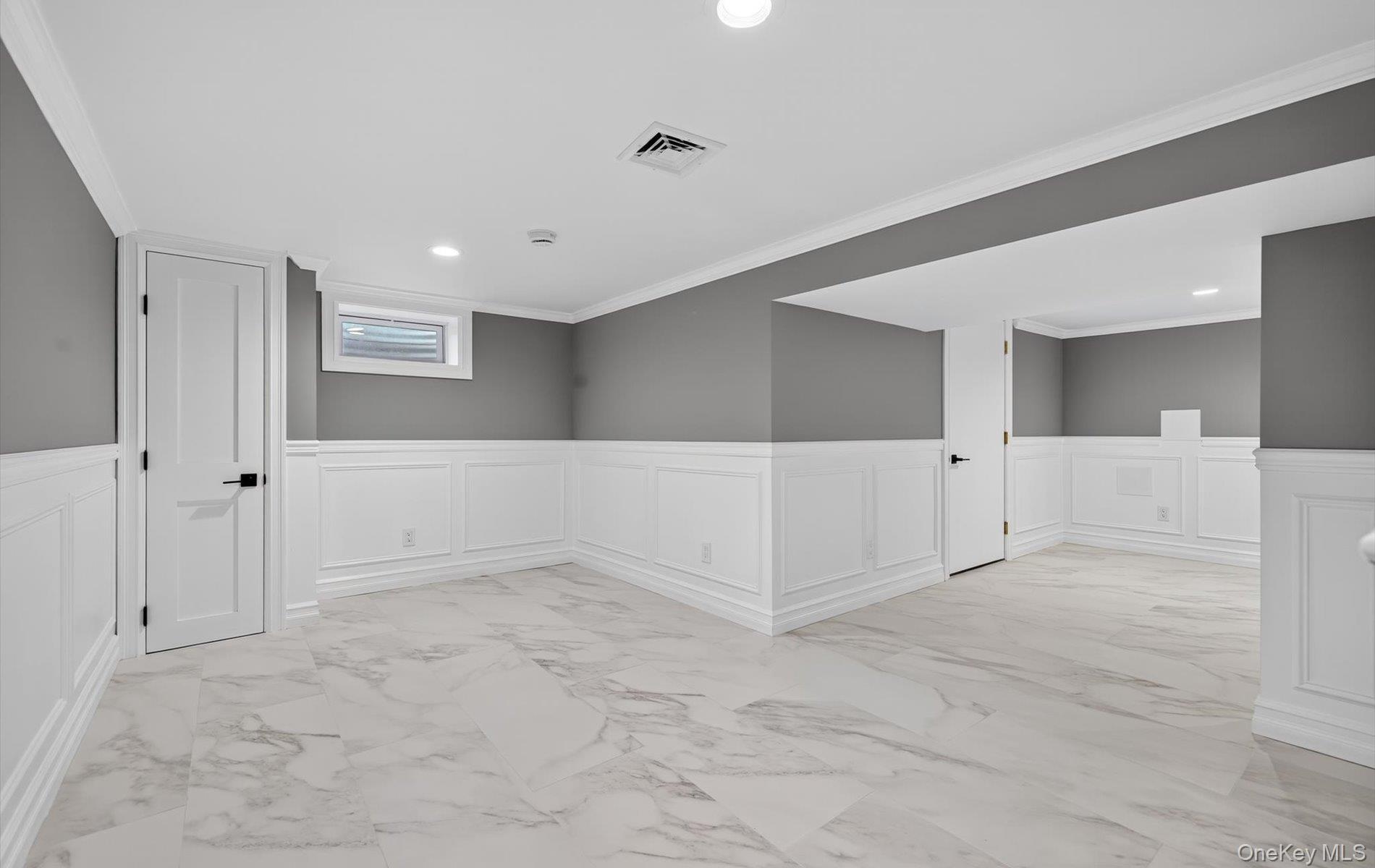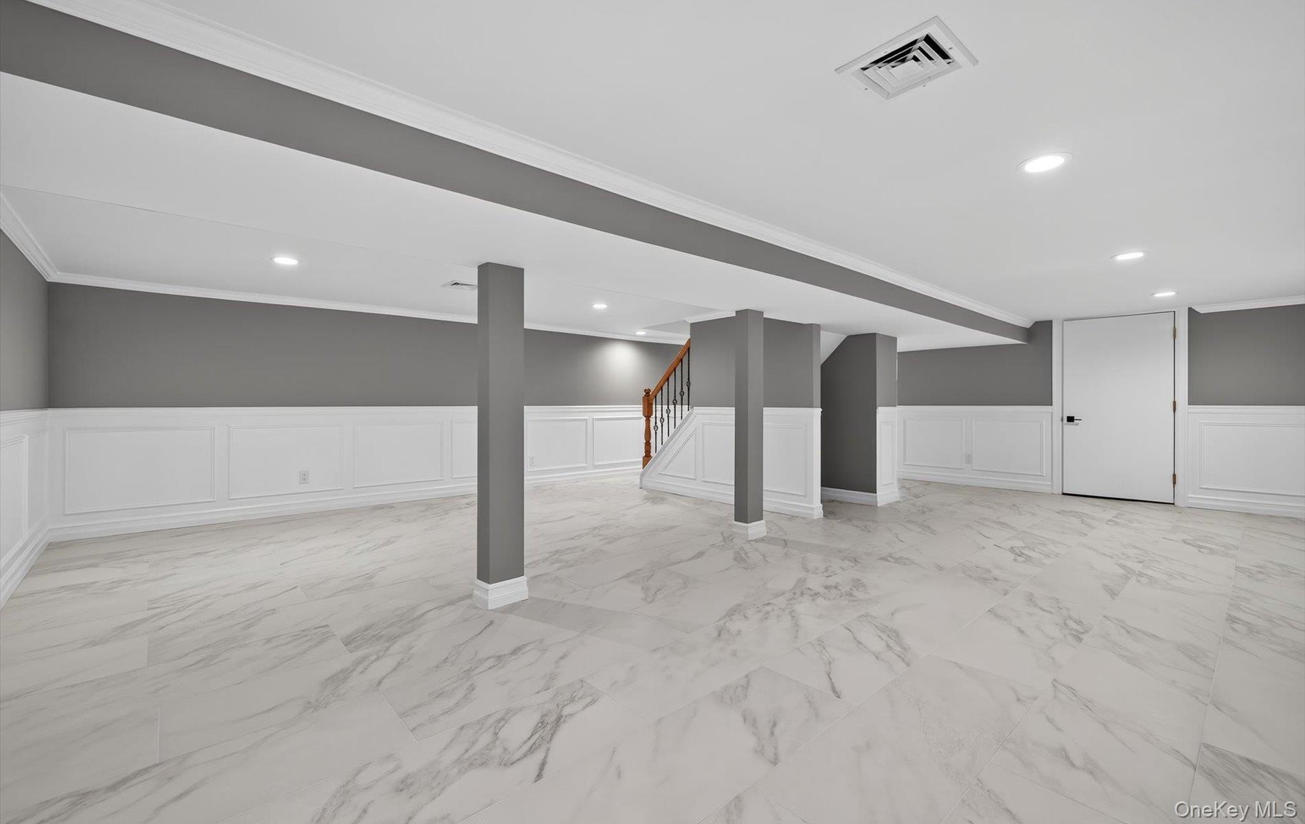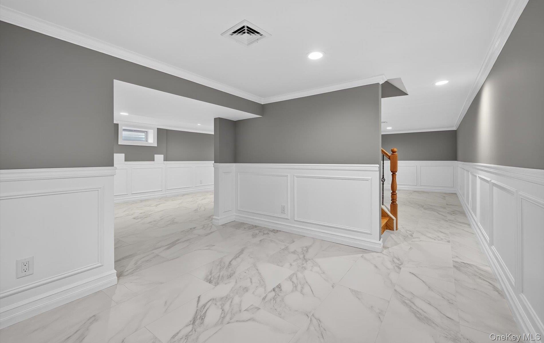 - Below grade area featuring a decorative wall, wainscoting, light marble finish floors, crown molding, and recessed lighting