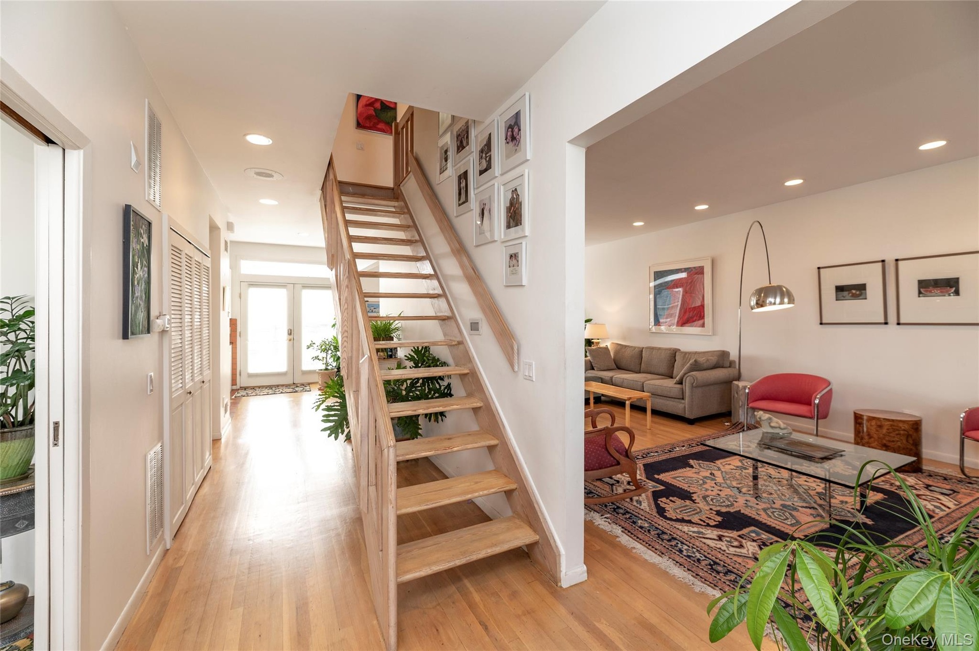 - Foyer with light wood-style floors, french doors, and recessed lighting