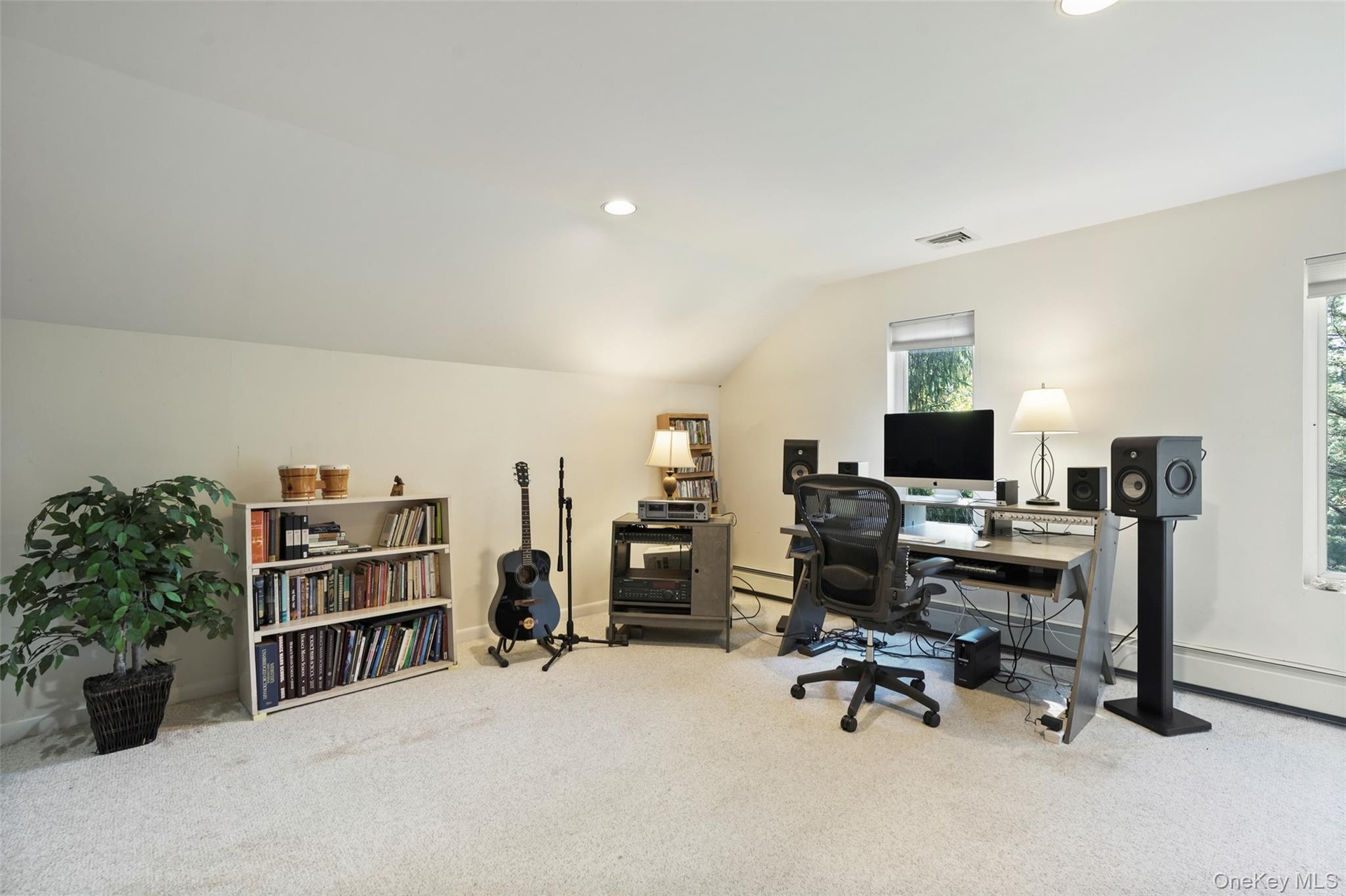- Carpeted home office featuring recessed lighting, lofted ceiling, and a baseboard radiator