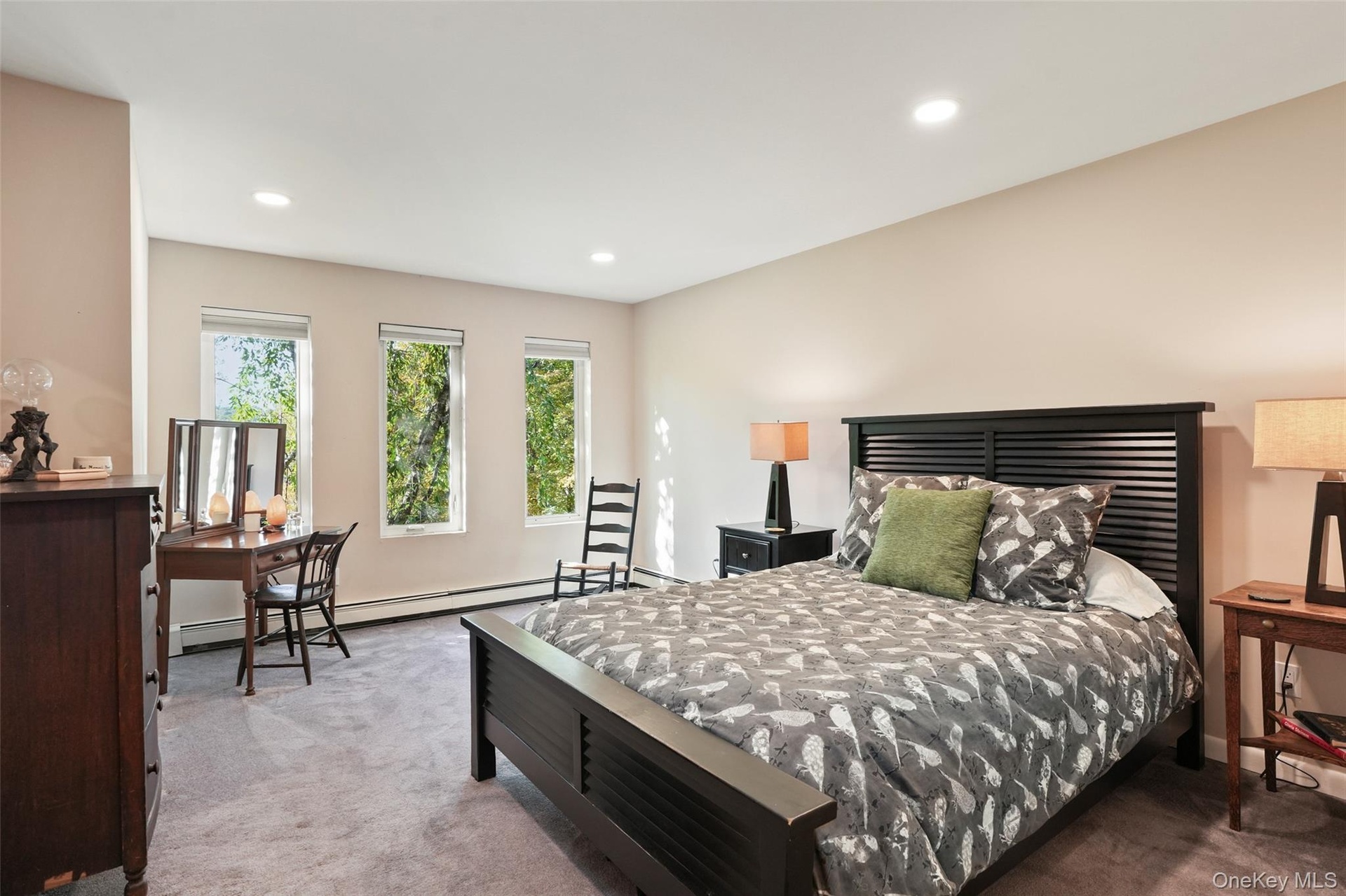 - Carpeted bedroom with recessed lighting and baseboard heating