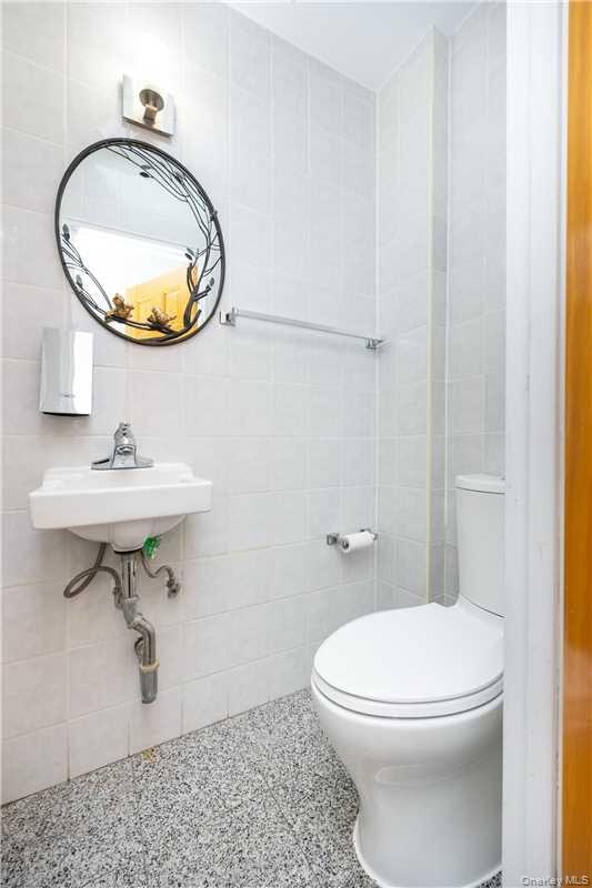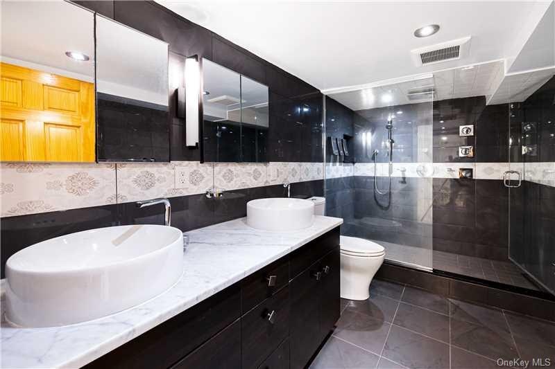 - Full bath with a stall shower, double vanity, dark tile patterned flooring, and tile walls