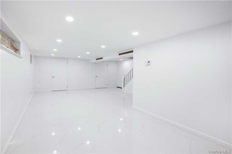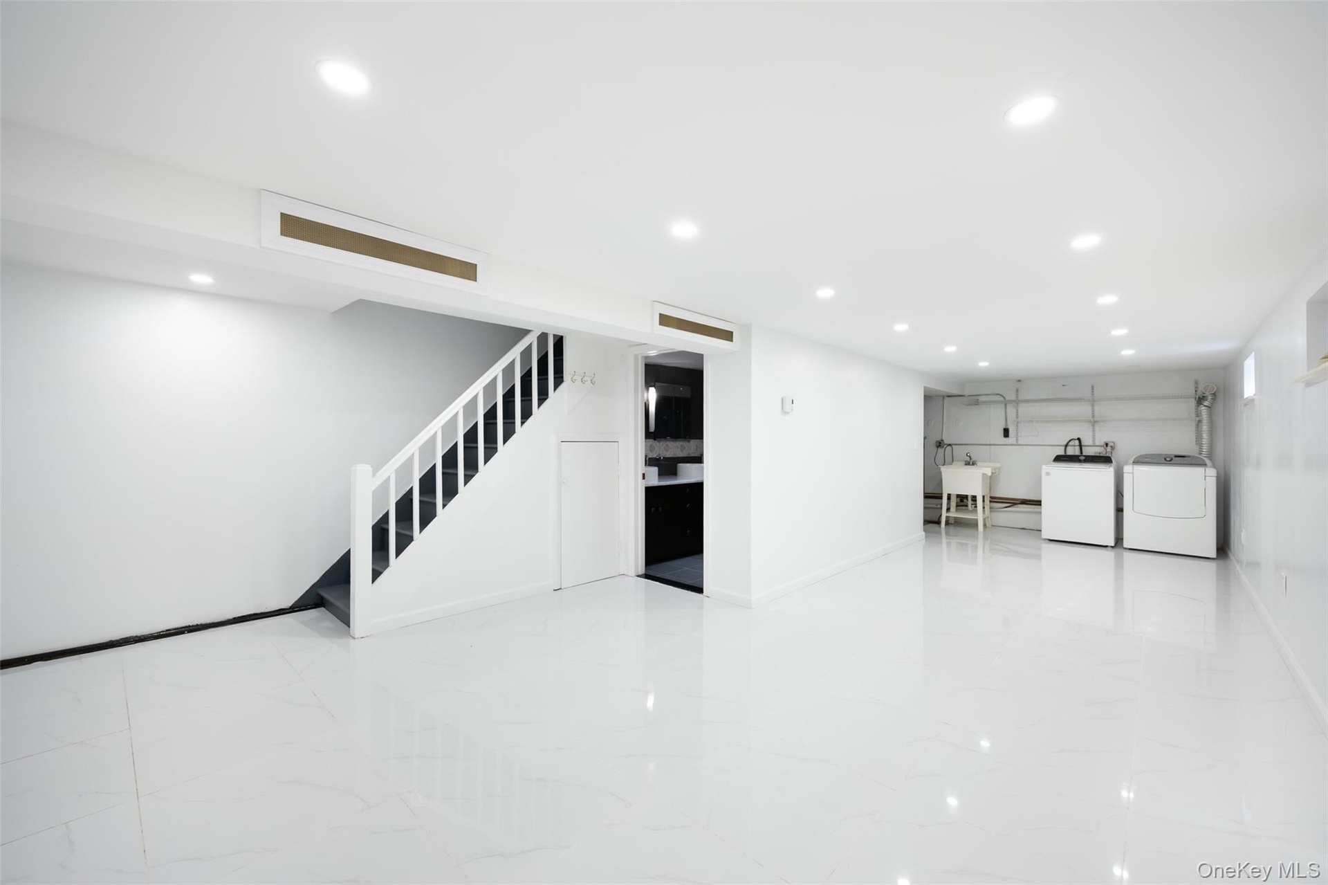 - Unfurnished living room with recessed lighting, separate washer and dryer, light marble finish flooring, and stairway