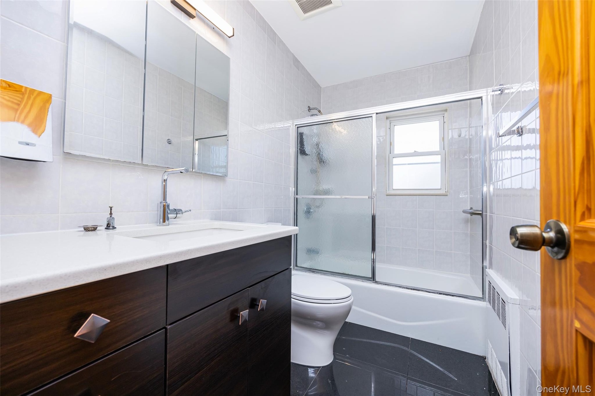 - Full bathroom featuring tile walls, bath / shower combo with glass door, radiator, and vanity