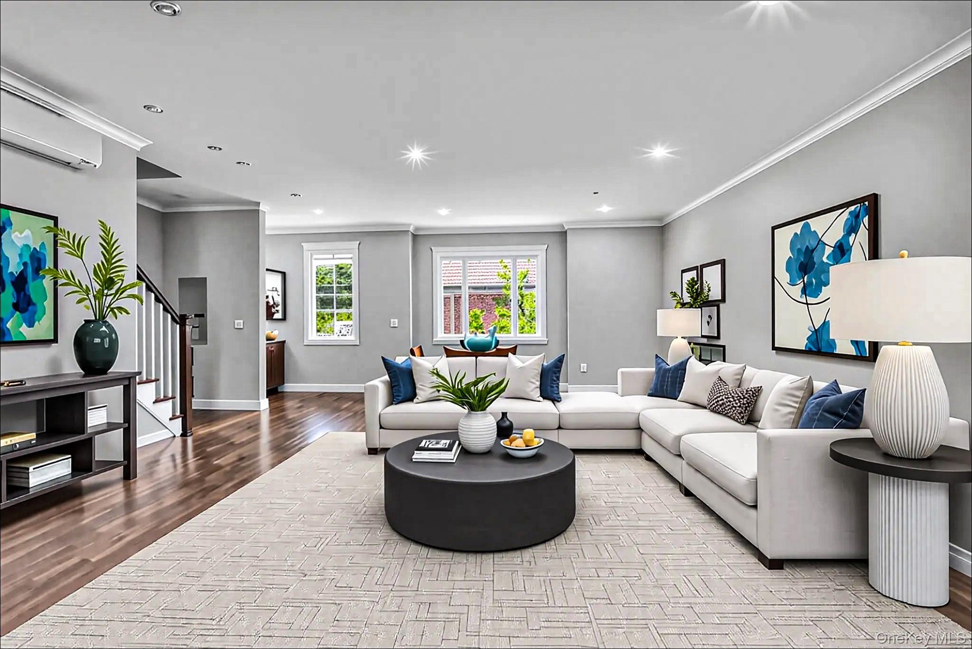 - Living area featuring ornamental molding, wood finished floors, recessed lighting, stairs, and an AC wall unit