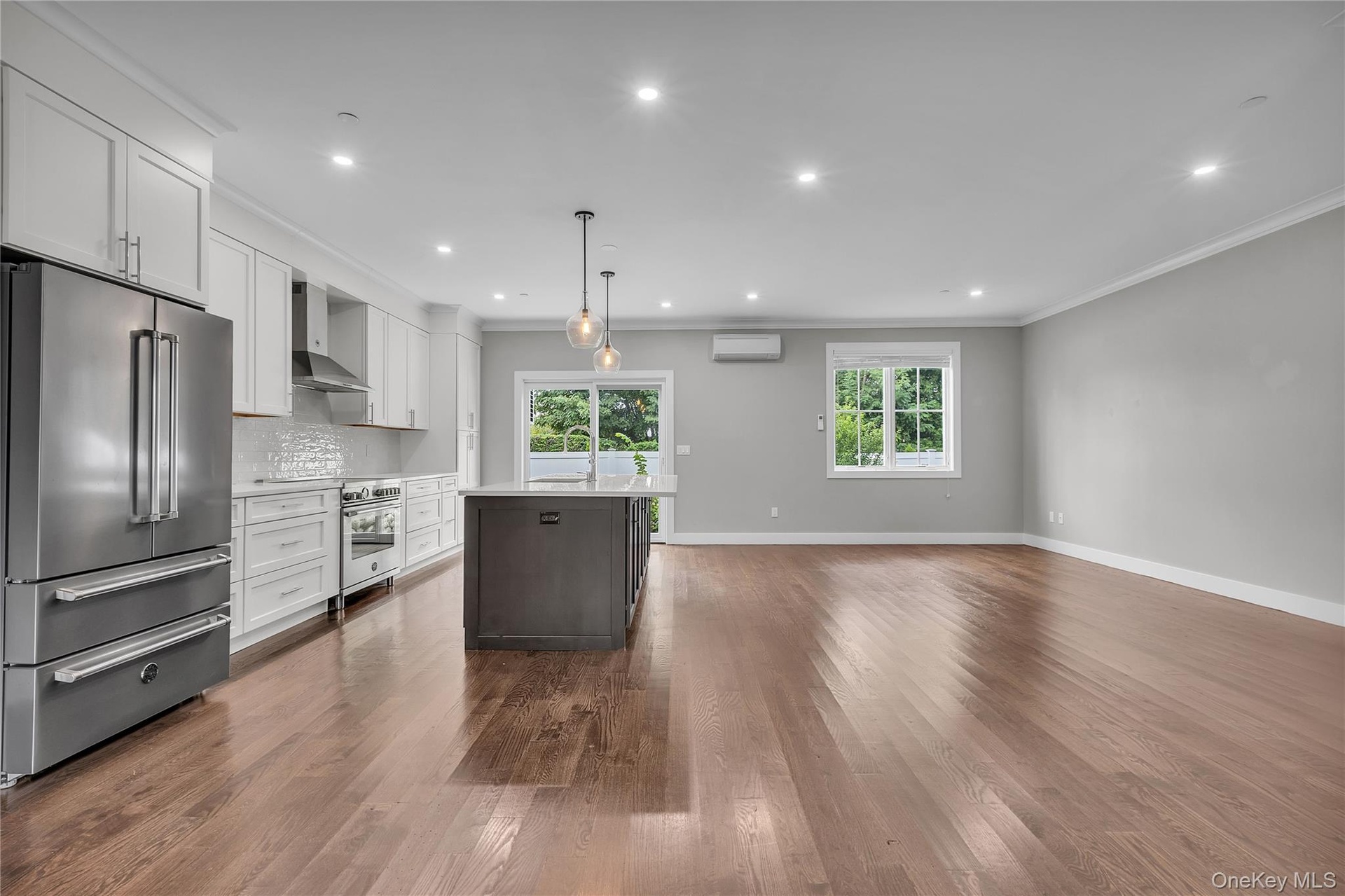 - Unfurnished living room featuring recessed lighting, dark wood-type flooring, crown molding, and an AC wall unit