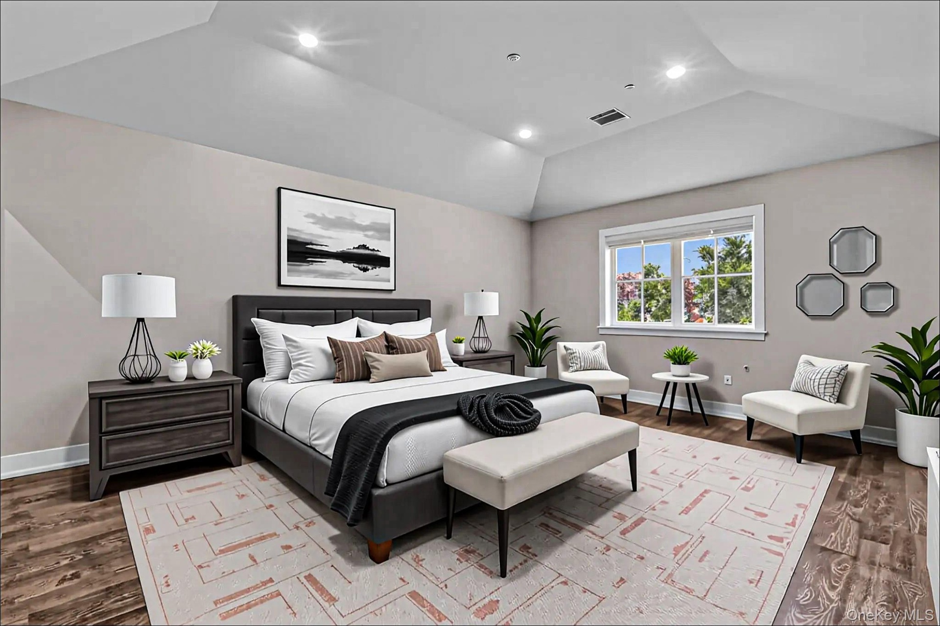- Bedroom with dark wood finished floors, recessed lighting, and vaulted ceiling
