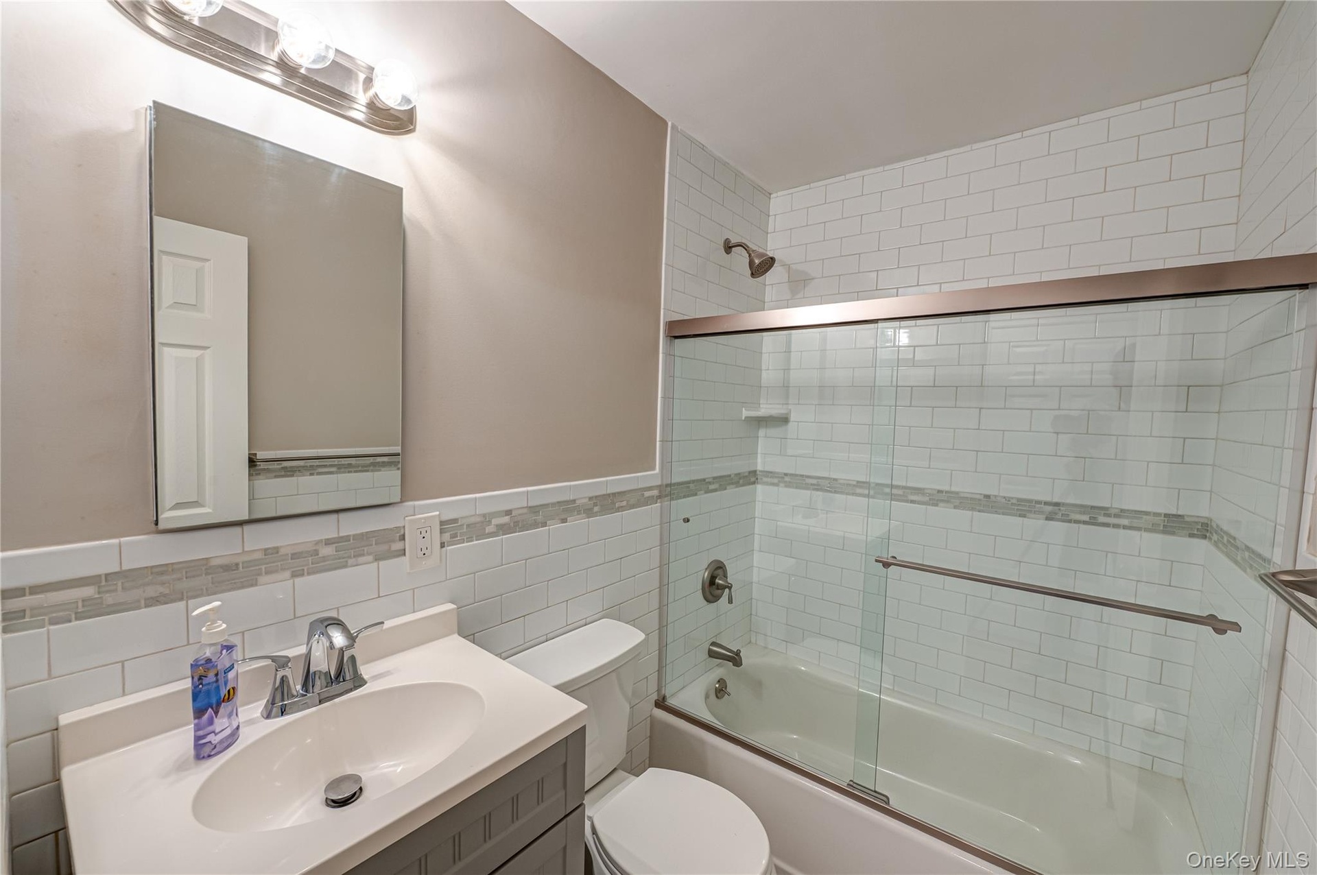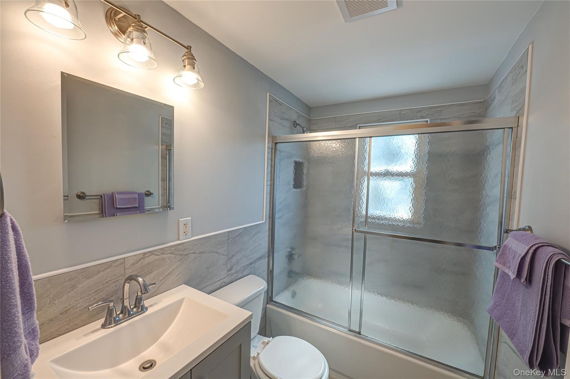 - Bathroom featuring combined bath / shower with glass door, vanity, and tile walls