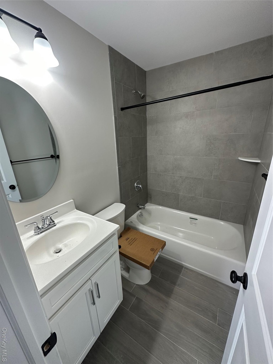 - Bathroom featuring bathing tub / shower combination, vanity, and dark wood finished floors
