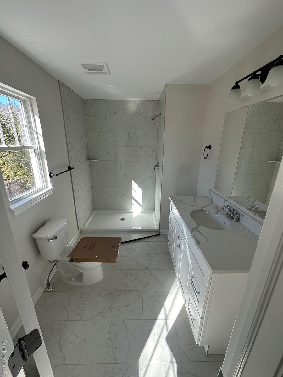 - Full bath featuring vanity, a shower stall, and light marble finish flooring