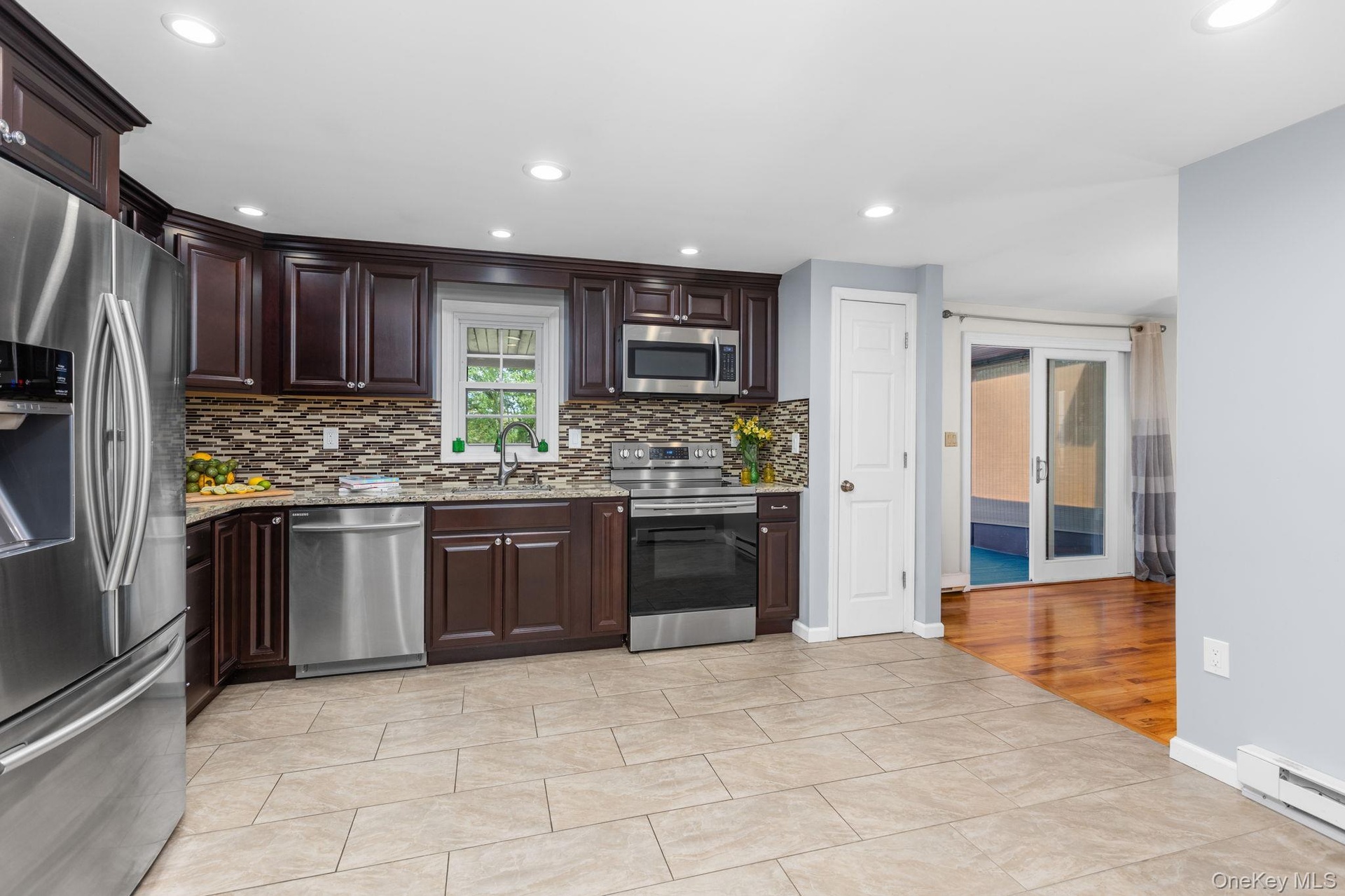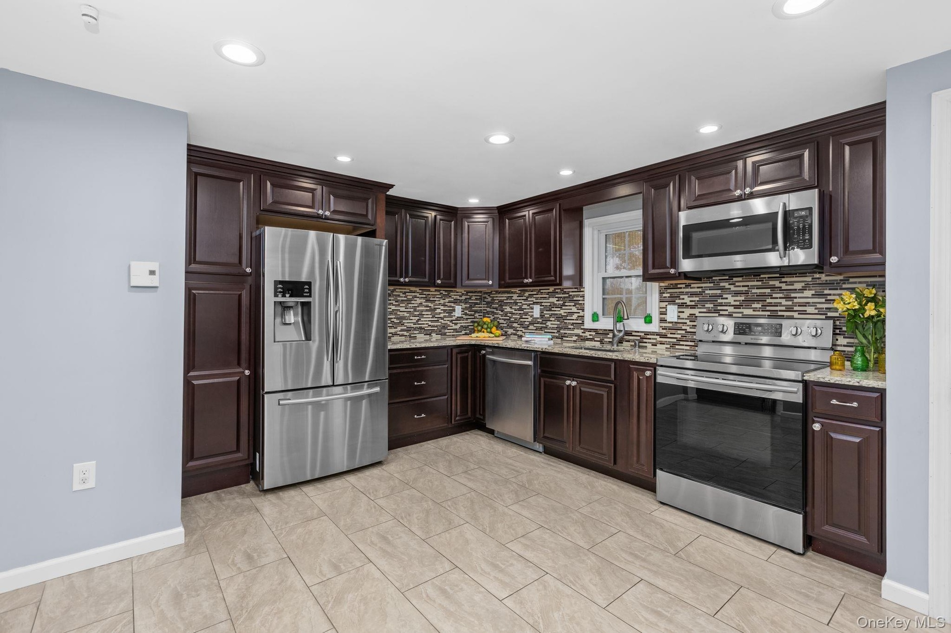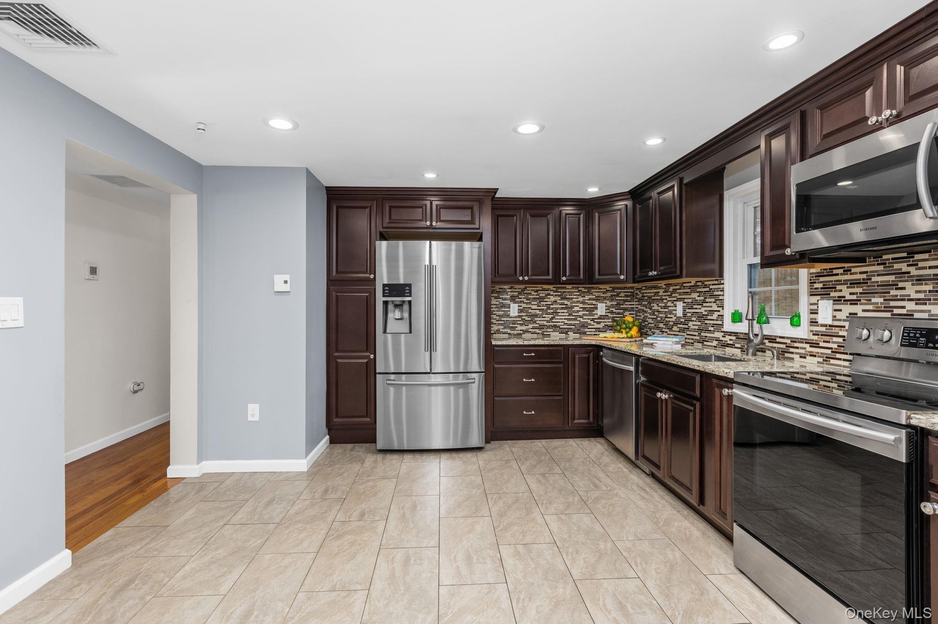 - Updated kitchen is enhanced by a decorative backsplash, pantry and gleaming dark cabinetry