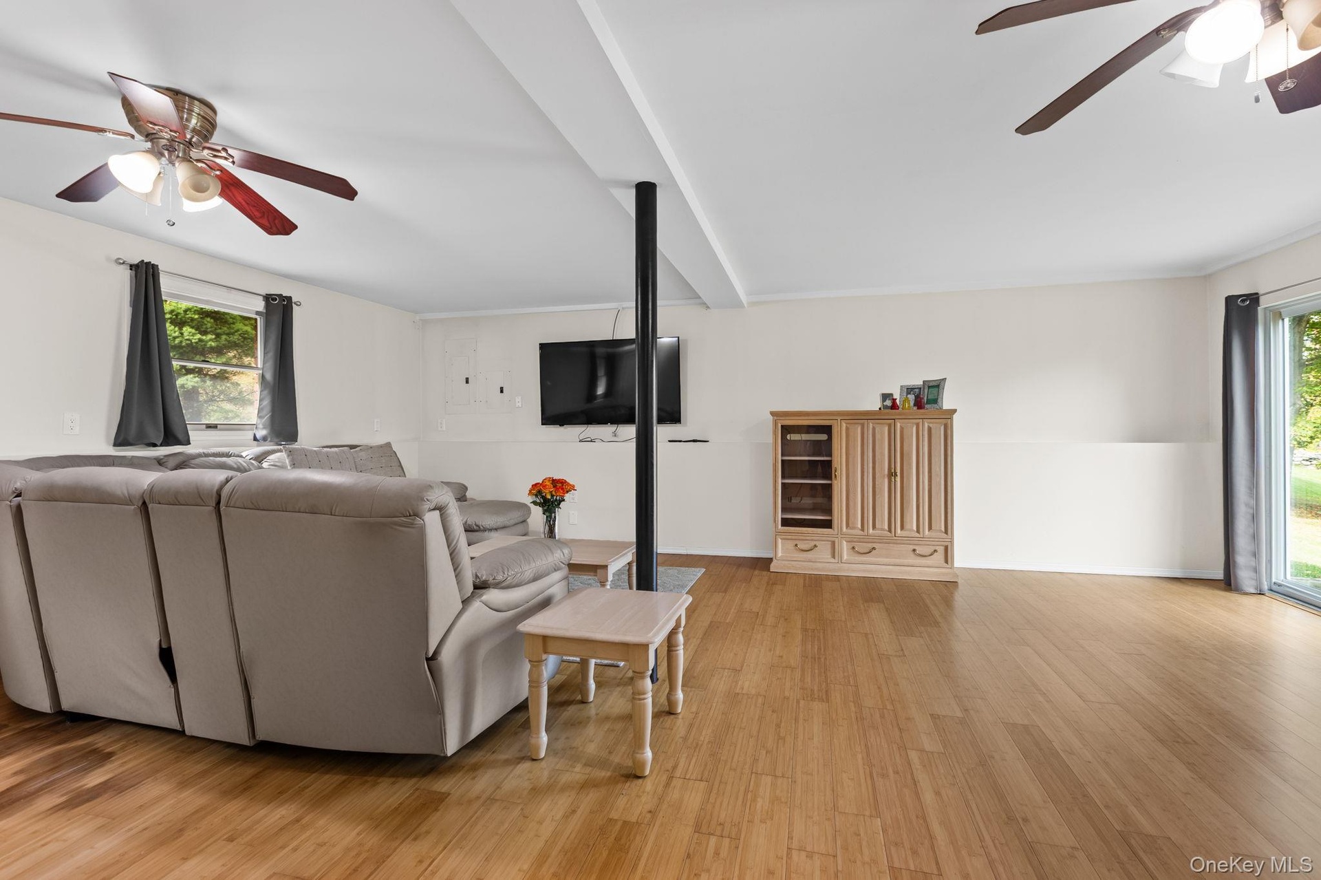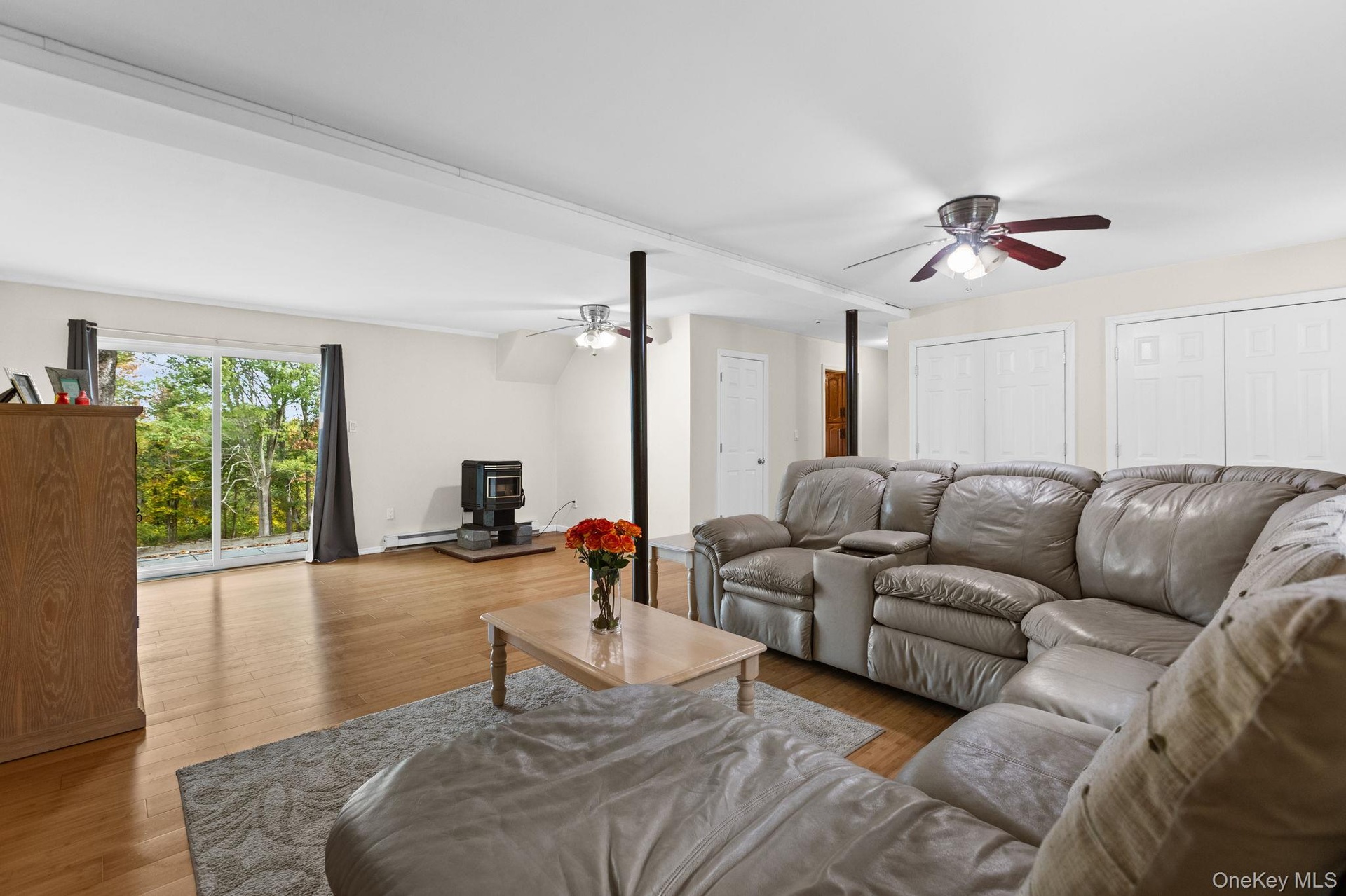 - Laminate flooring, large closets, pellet stove and access to the stone patio lend versatility to the room