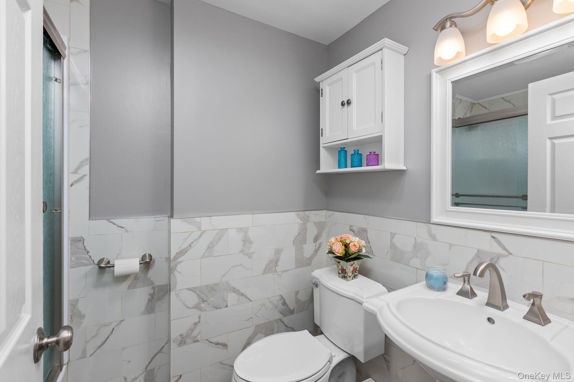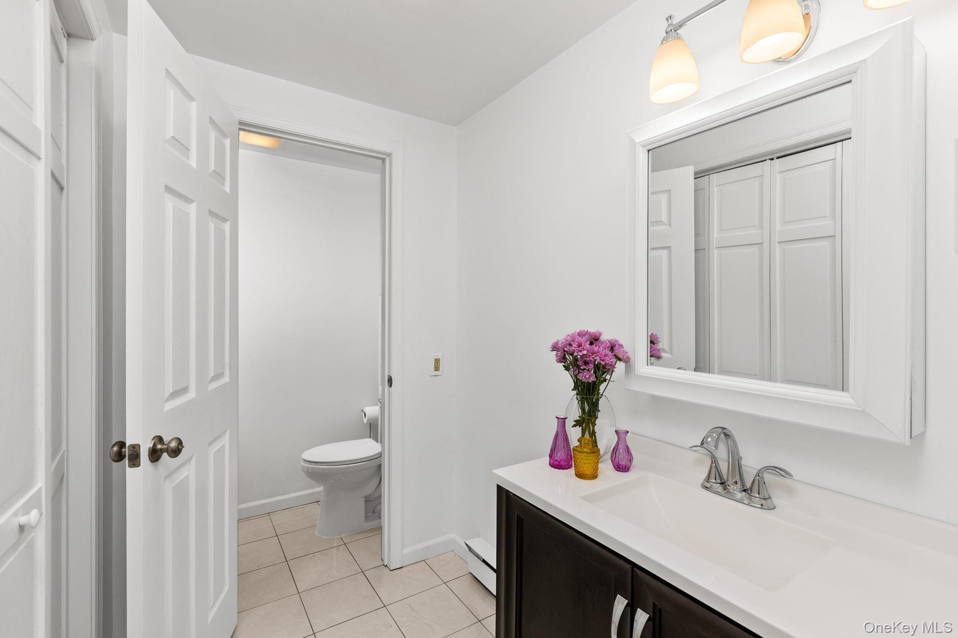 - The updated hall bath with its pedestal sink, task lighting and glass enclosed tub is conveniently placed near the main living spaces and two bedroom
