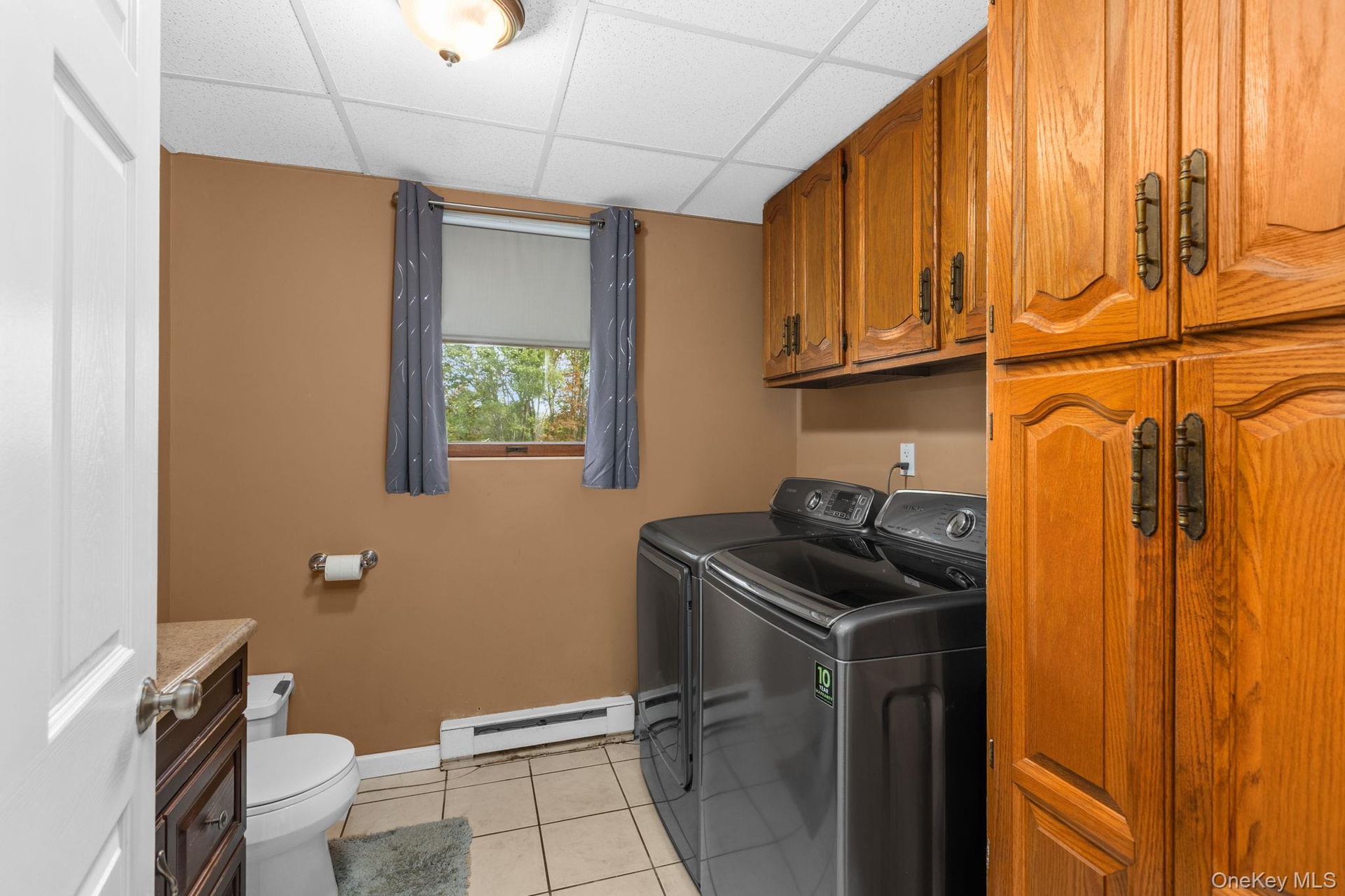 - Powder room with washer and dryer, storage and cabinetry is located next to the family room
