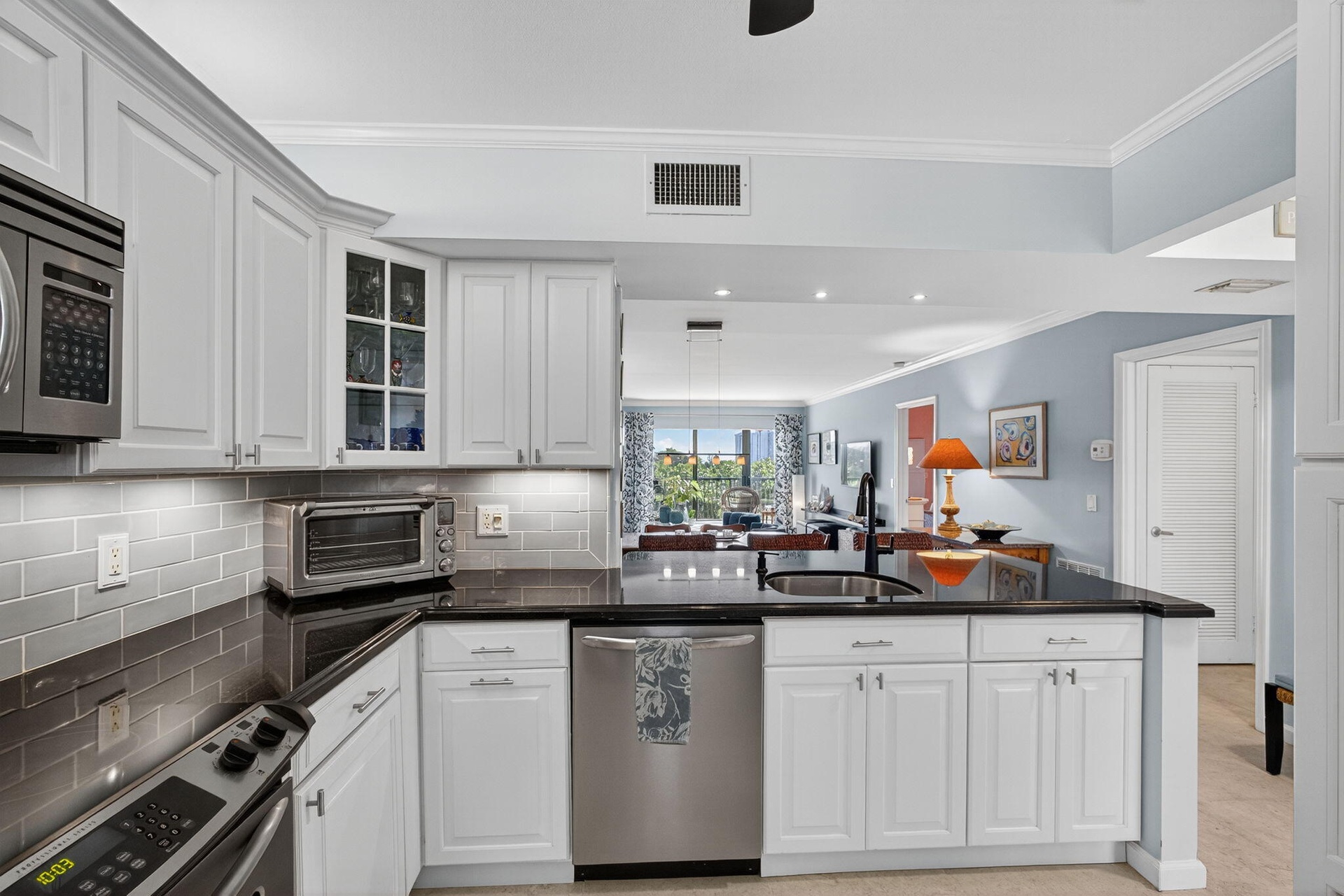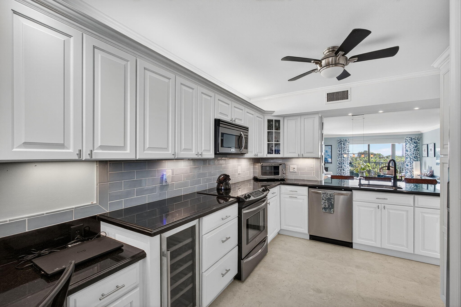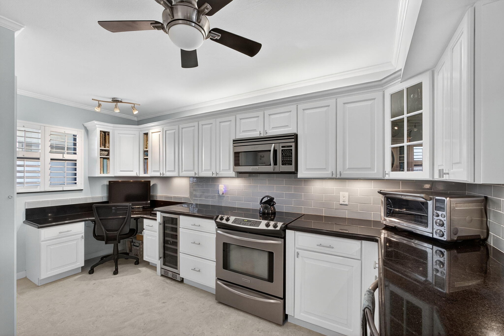 DescriptionWalk to the turquoise waters of Jupiter Beach from the beautifully renovated & updated penthouse condo in the seaside community of Ocean Parks. Relax on the screened & impact glass enclosed lanai, now a comfortable sun room that offers additional living space & constant ocean breezes. Lovely redesigned kitchen offers an open floor plan with great views, additional solid wood cabinetry. built-in office area, SS appliances, custom backsplash. Both baths updated w/ walk-in showers, tiled floors, new vanities, lights, fixtures & mirrors. Custom walk-in closet in primary; closet organizer in guest; all wood & tile flooring; impact glass complete; plantation shutters; crown molding; custom shades & storage closet in sunroom; ceiling fans; Carport ''BB''; NEW A/C & water heater; full sized W/D,