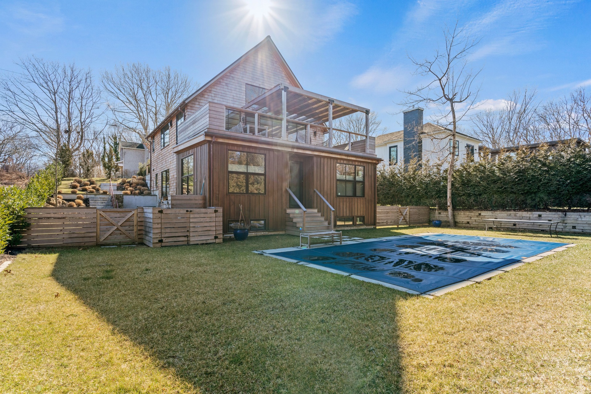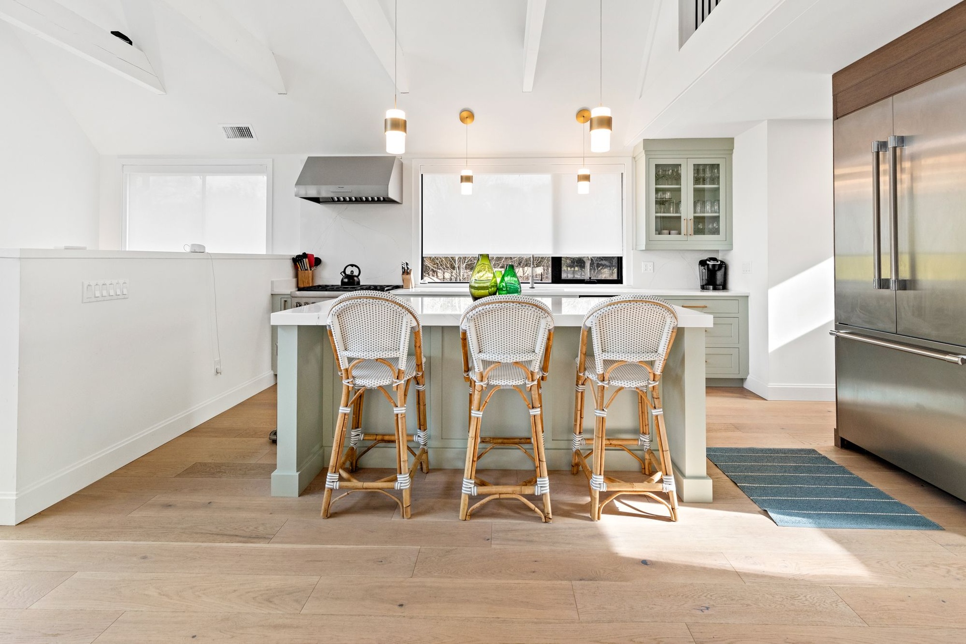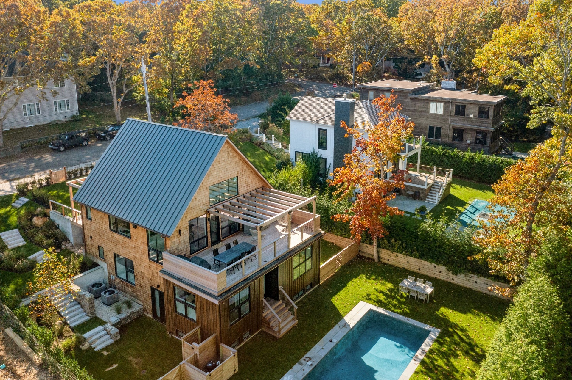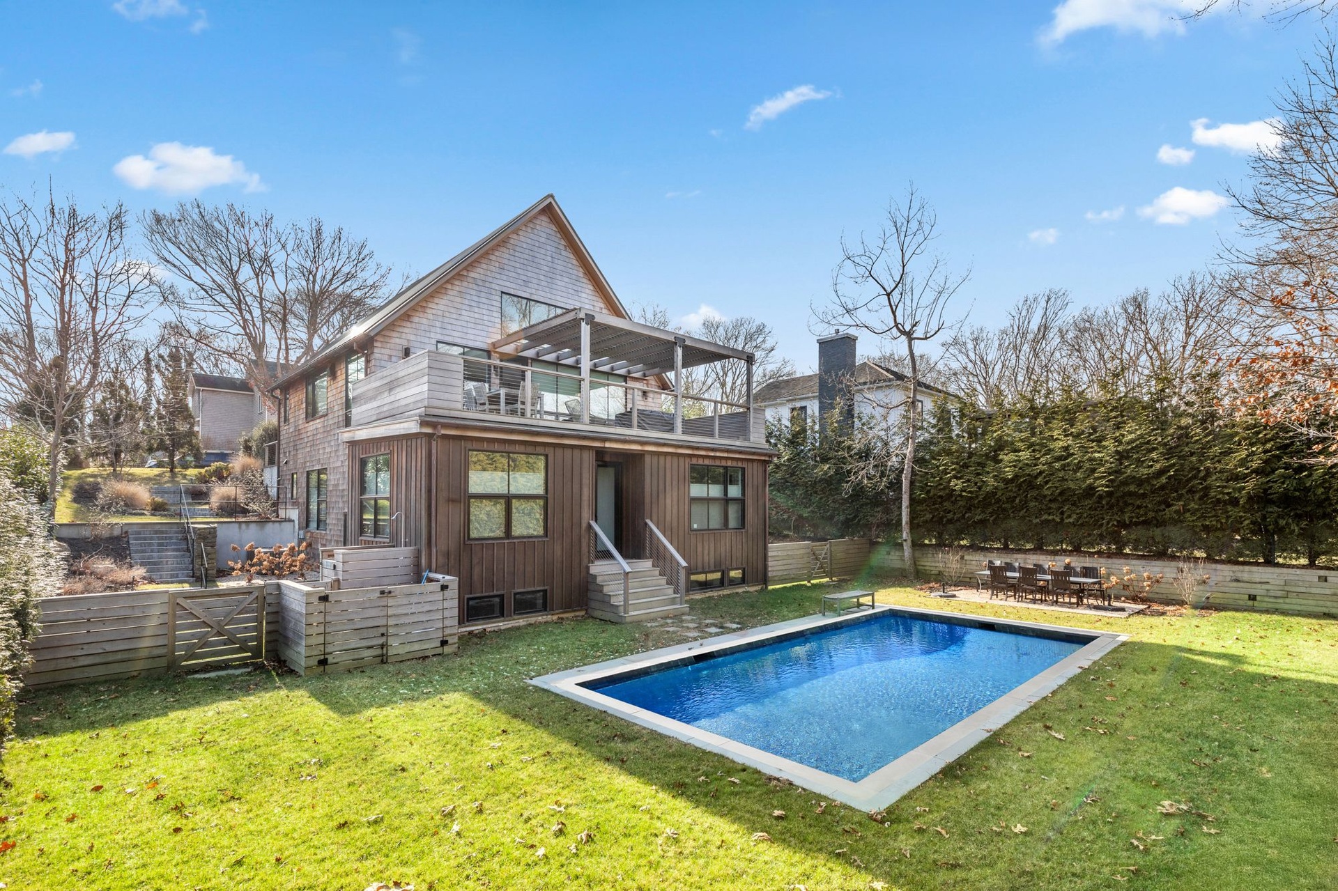 Newly Built - Private beach access. This cedar shingled modern cottage has 4 bedroom 3.5 baths, with all the bells and whistles one could ask for!. High end appliances, radiant flooring on the lower level, HVAC 3 zones, Quartz custom designed counter tops and backsplash- Gym and Media room and a full office on the lower level. A 16 x 40 Gunite pool.The Beach is just a stones throw away. Rental comes with 2 vintage his and her Gary bikes. It's a must see.