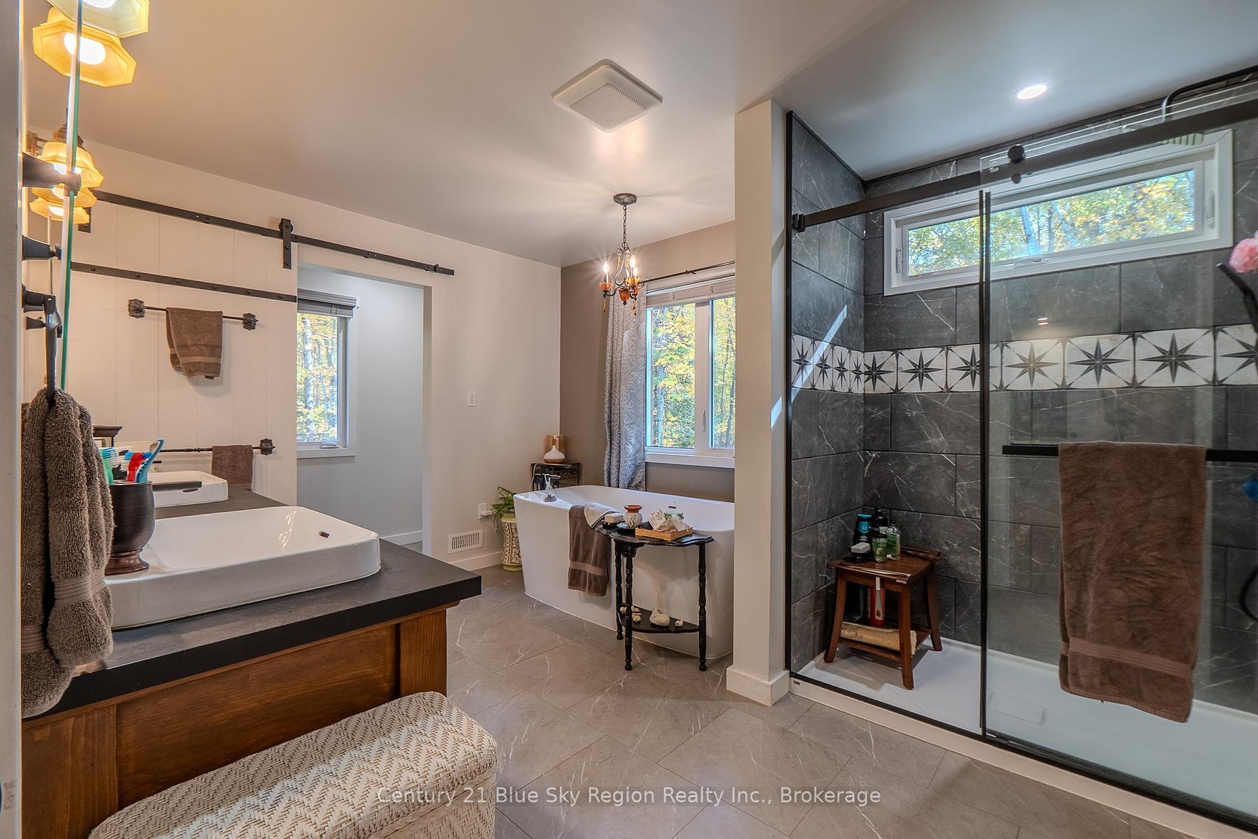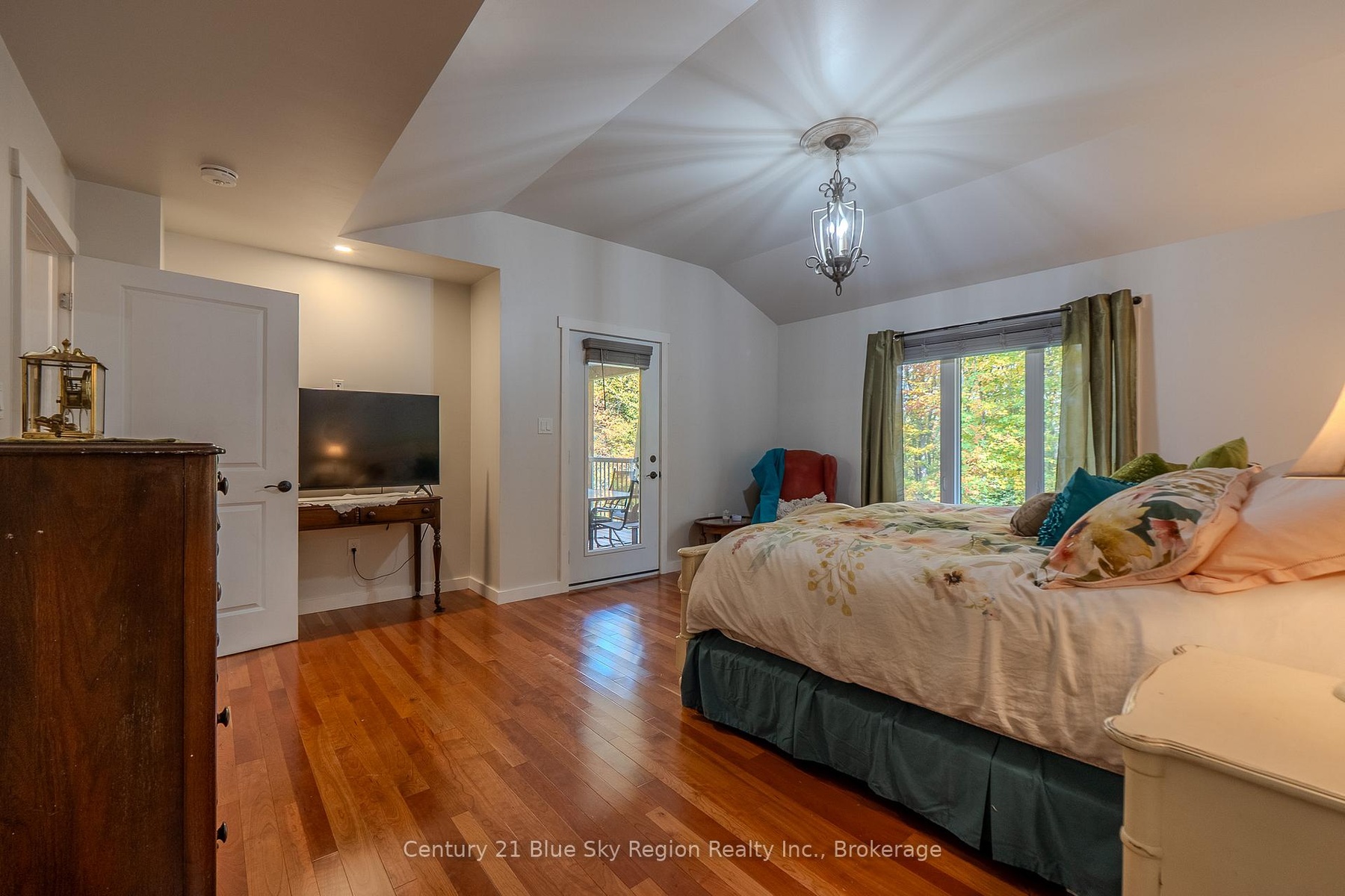 Privately set on nearly 10 acres and 400 feet from the road, this craftsman house was created with accessibility and light in mind. Wide hallways, spacious rooms, and 32"+ doorways. The front porch welcomes you into a spacious, tiled entry. Off the entry is a bright bathroom featuring a unique vanity, walk-in shower, toilet, and a barn-style cheater door leading to a large, well-lit bedroom. The great room features a propane fireplace with built-in storage cabinets and a coffee nook. A terrace door welcomes you to a 10X28 deck with a propane hookup for entertaining and BBQ'ing. The open concept kitchen features full-height uppers, a large island, and Silestone countertops, a tiled cooking area boasting a 36" THOR propane range with a pot filler and adjoining prep-pantry with a baker's pass-through to the kitchen. A side-by-side fridge and freezer finish the kitchen. The Master bedroom features a large walk-in shower, a stand-alone tub, double sinks, and a linen closet. The master suite is completed with an impressive walk-in closet. Descend to the walk-out lower level with storage and central vac located under the stairs. A 2-piece marble floor washroom is at the bottom of the stairs next to another storage/workshop area, and a versatile 14'X24' sewing/exercise room. Large windows and a terrace door lead to the rear stone patio. Flexibility is the word with roughed-in plumbing and doorways that allow for a conversion in a granny suite. The lower level includes a large rec room with wiring for recessed speakers. CAT-5 is fed into every TV space to take advantage of the Fibe internet servicing the house. The basement also features a wood fireplace, kitchenette, 2 bedrooms, a large 3-piece bath, and a terrace door to the patio. The home is heated by a high-efficiency furnace with LifeBreath HRV and cooled by A/C.A full service generator provides power during outages.