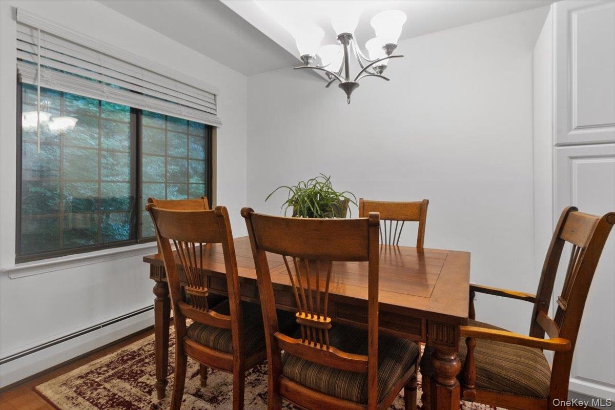 - Dining room featuring a chandelier, a baseboard heating unit, and wood finished floors