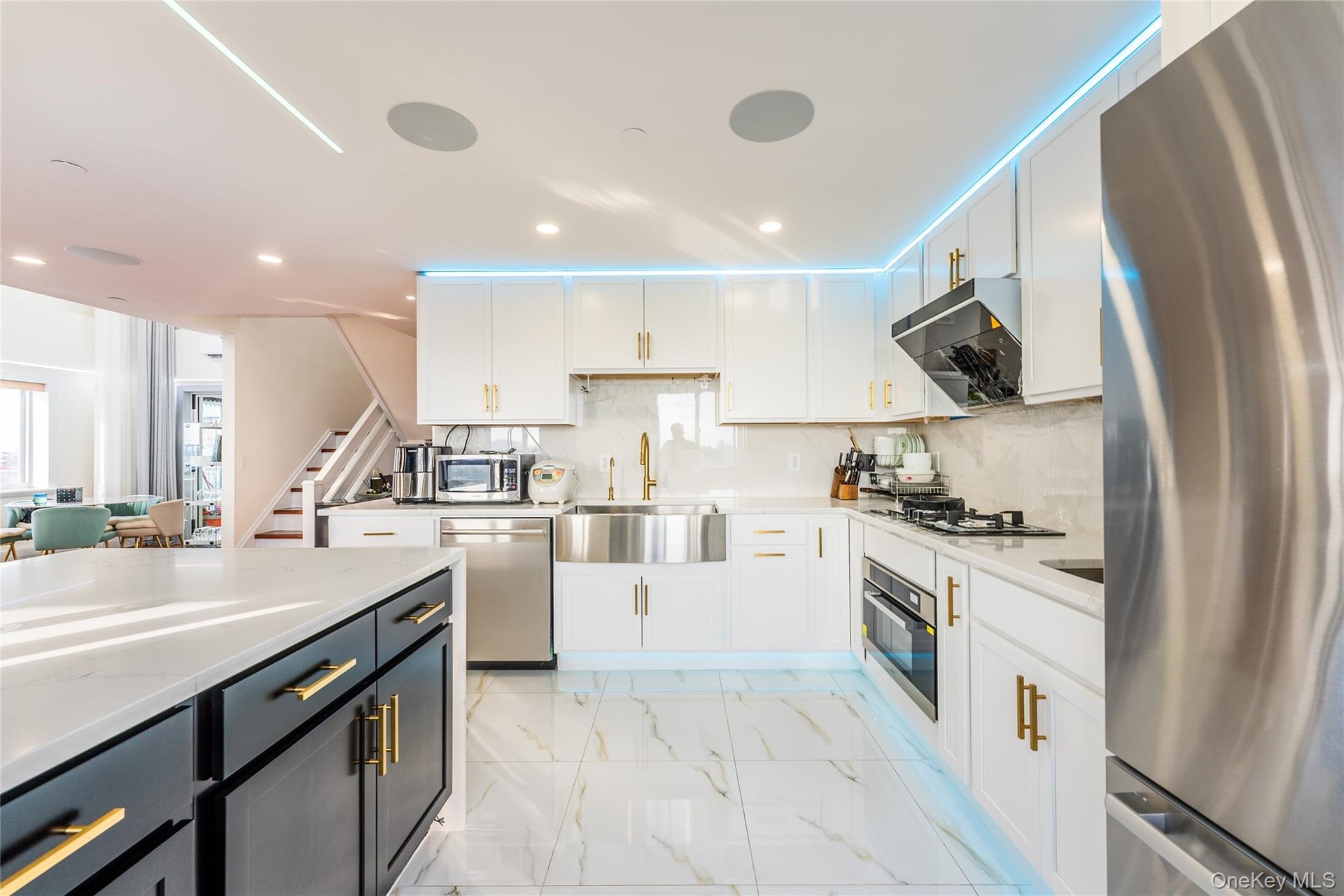 - Kitchen featuring appliances with stainless steel finish, white cabinetry, light marble finish floors, open floor plan and decorative backsplash