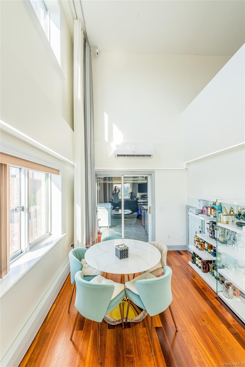- Dining room with a towering ceiling, wood finished floors and a wall mounted air conditioner