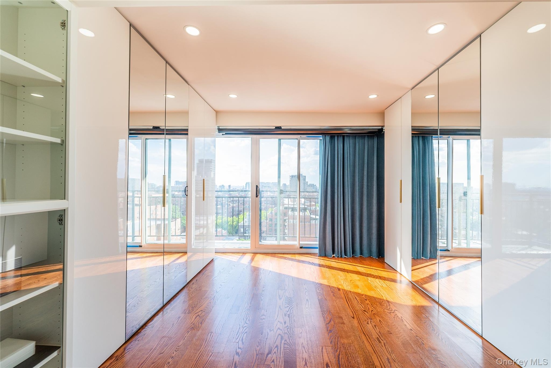 - Unfurnished room with wood finished floors, a view of city and recessed lighting