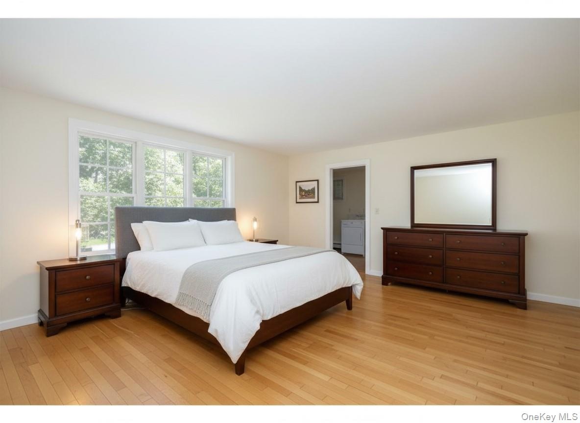 - Empty room featuring light wood-type flooring and washing machine and clothes dryer