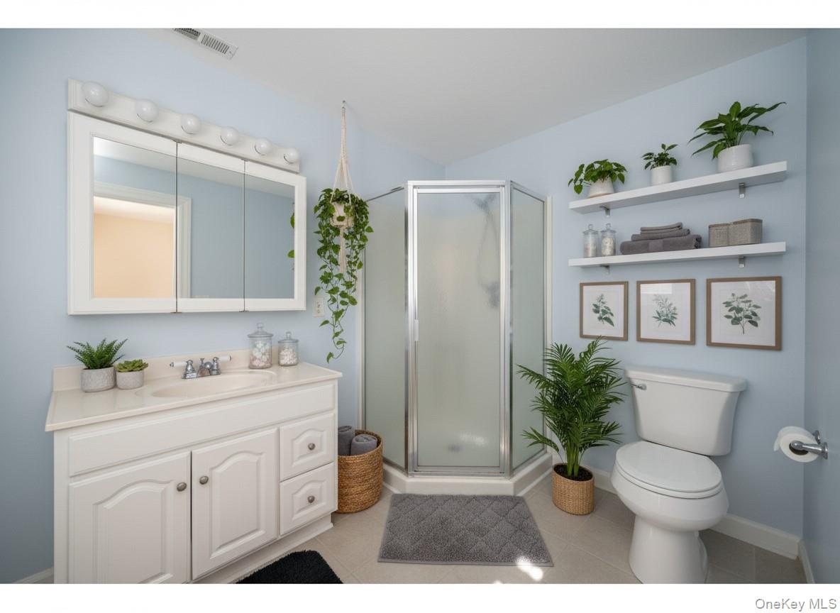 - Bathroom featuring vanity, a stall shower, and light tile patterned floors