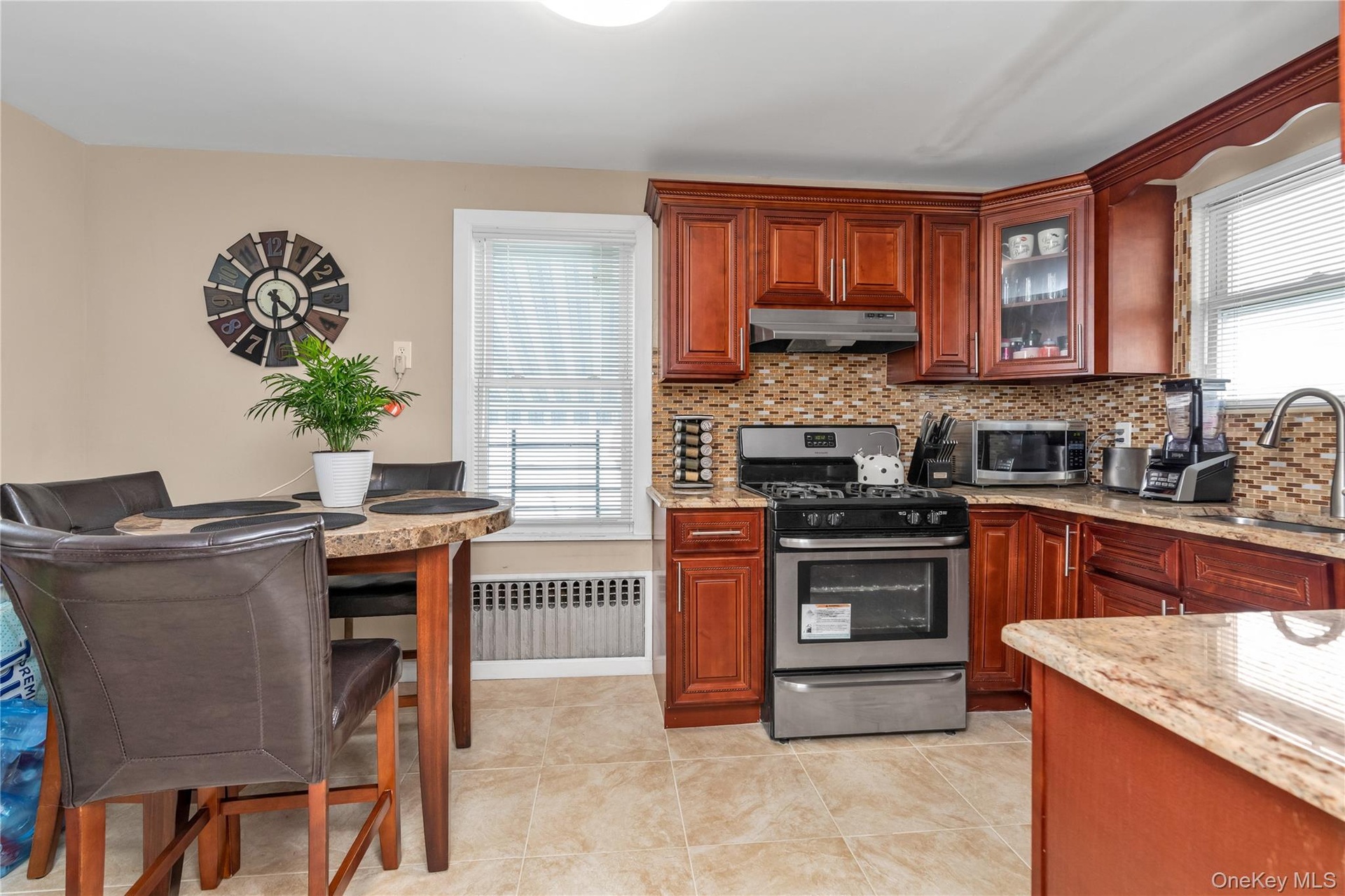 - Kitchen with stainless steel appliances, light tile patterned floors, backsplash, radiator heating unit, and plenty of natural light