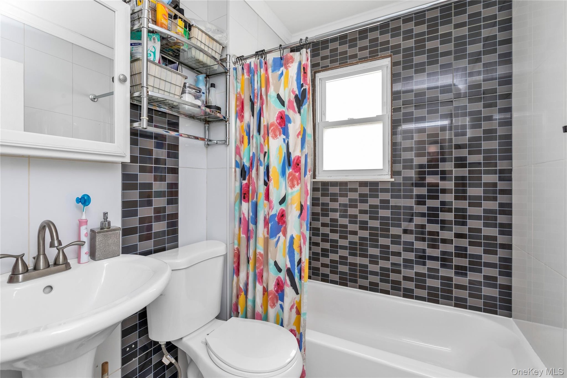 - Bathroom featuring tile walls, shower / tub combo, and vanity