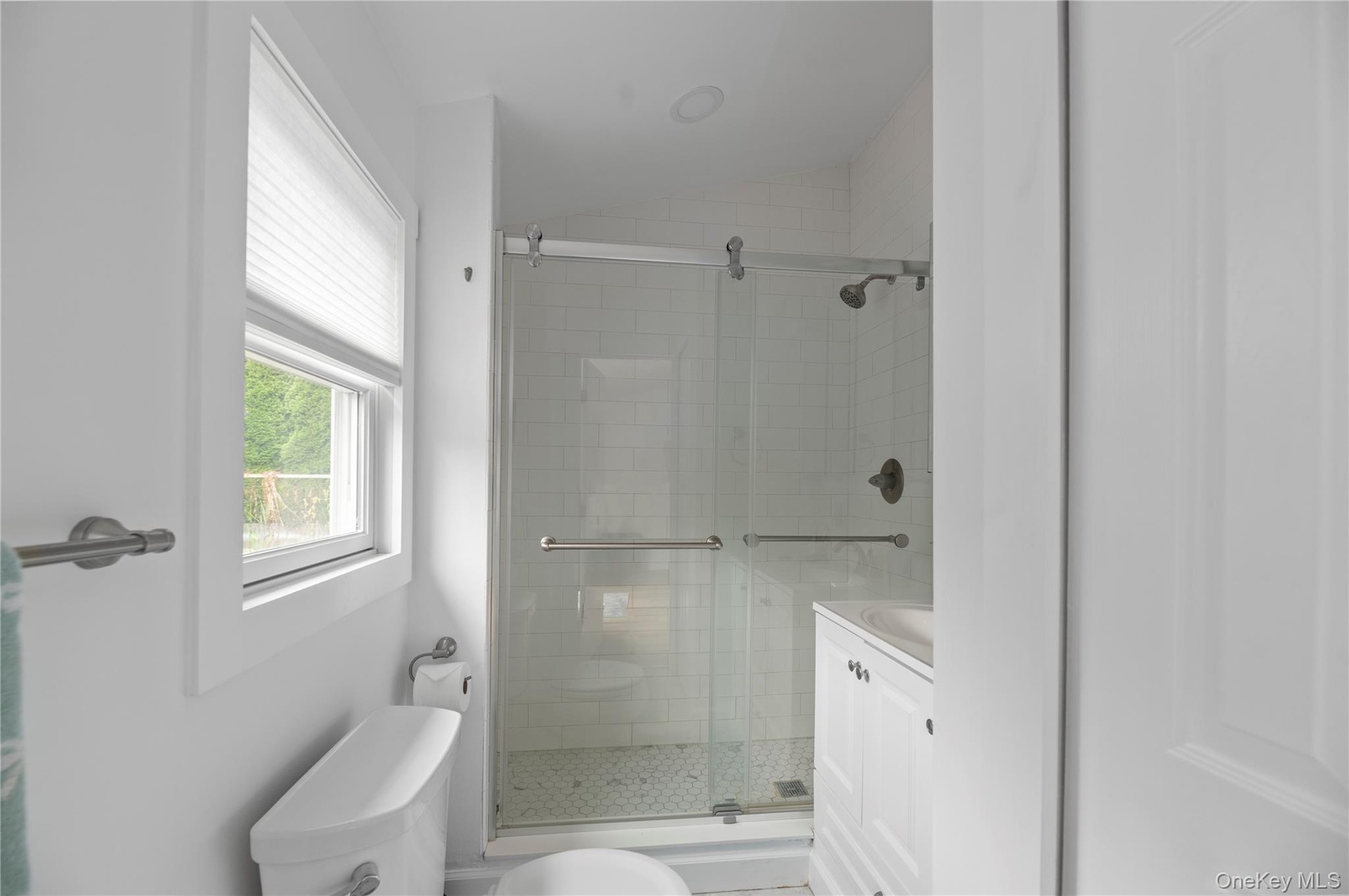 - Bathroom with a stall shower, vanity, and lofted ceiling