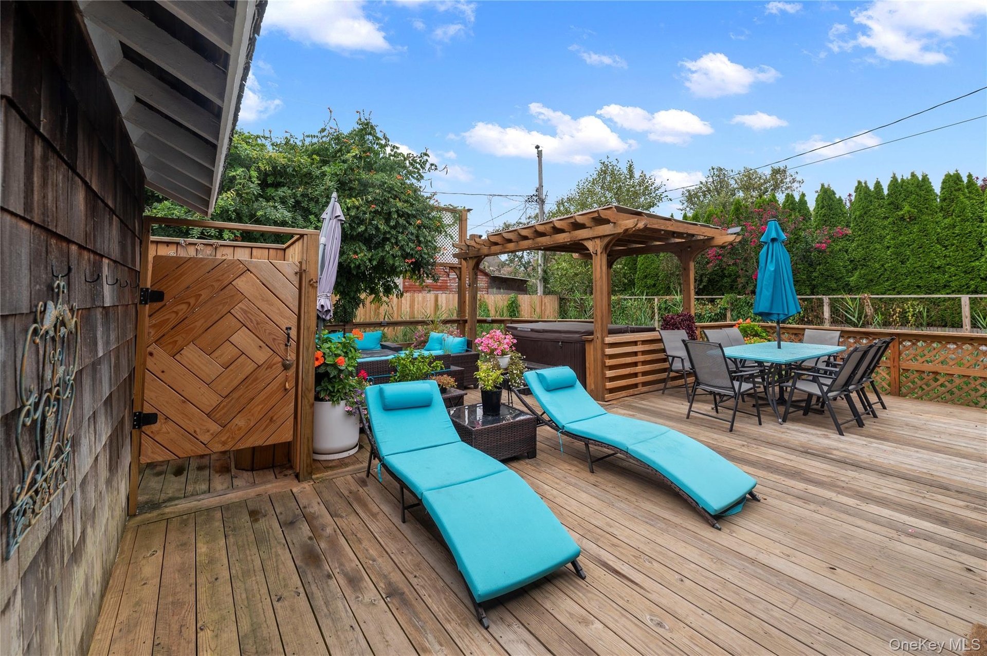 - Wooden terrace featuring a hot tub, outdoor dining area, and a fenced backyard