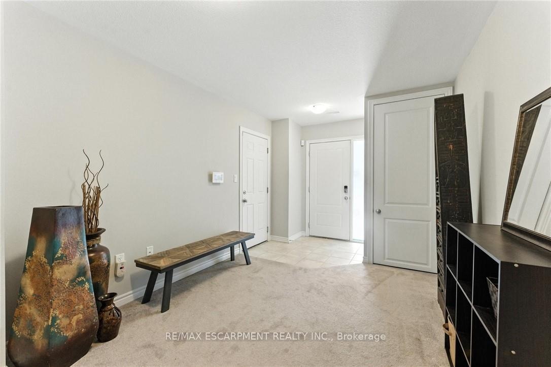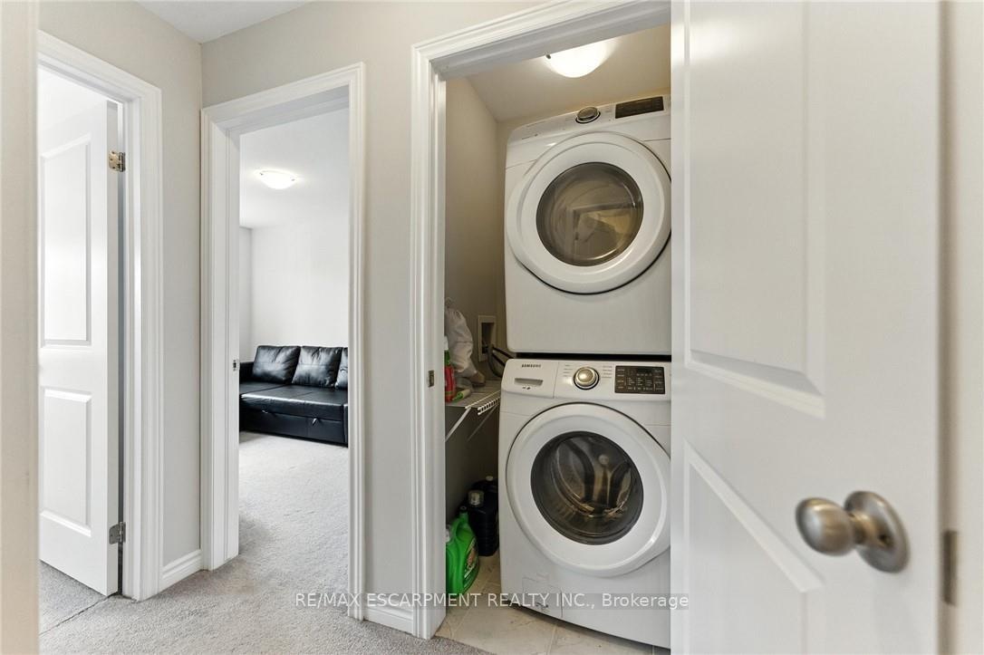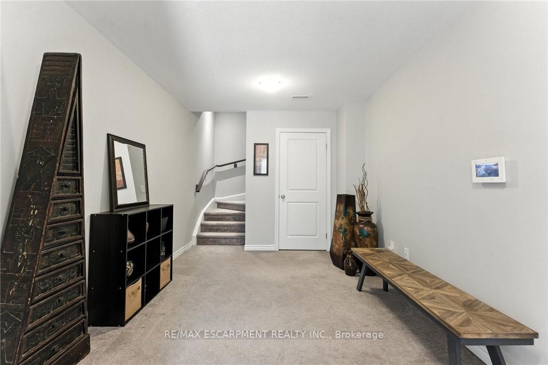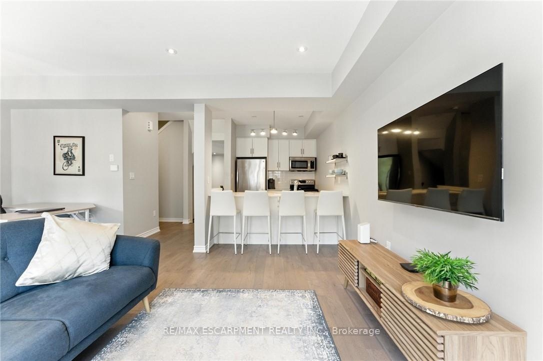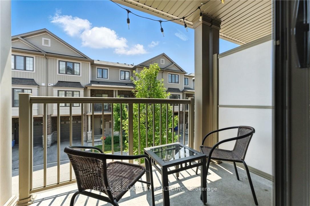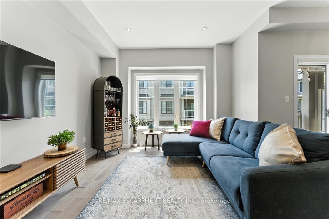 Welcome to this bright and spacious 2-bedroom, 2-bathroom townhome nestled in a quiet and desirable Ancaster neighbourhood. Designed with both comfort and functionality in mind, this home wont disappoint! The main floor features a versatile multi purpose den, perfect for a home office, workout area, or cozy retreat, along with a large closet for ample storage. Upstairs, discover a stunning open-concept living space bathed in natural light from expansive windows and patio doors leading to a Juliet balcony. Entertain with ease in the upgraded kitchen, complete with stainless steel appliances, quartz countertops, pot lights, a breakfast bar that comfortably seats four, and a seamless flow into the dining area. The living room is equally inviting, featuring wide-plank hardwood floors and brilliant natural light by day, transitioning to warm, ambient lighting at night. The third floor offers an upgraded primary bedroom with a generous walk-in closet and a large window that fills the space with light. A spacious second bedroom also features a walk-in closet, offering plenty of room for guests, family, or additional office space. Convenient bedroom-level laundry adds modern practicality, while the main bathroom impresses with a double vanity and a sleek glass-enclosed shower. Ideally located just minutes from the vibrant Meadowlands shopping and dining district, highway access, and scenic nature trails, ensuring the perfect balance of urban convenience and peaceful surroundings.