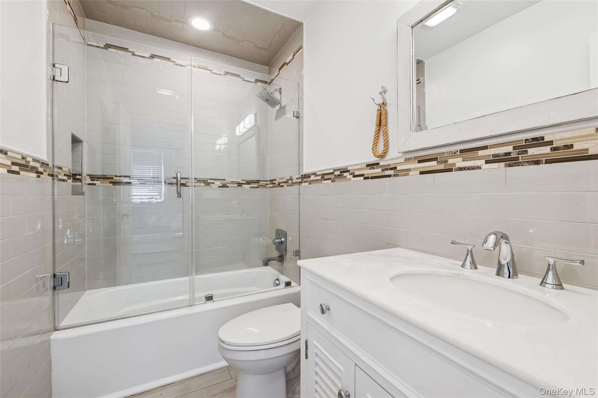 - Full bathroom with combined bath / shower with glass door, tile walls, and vanity