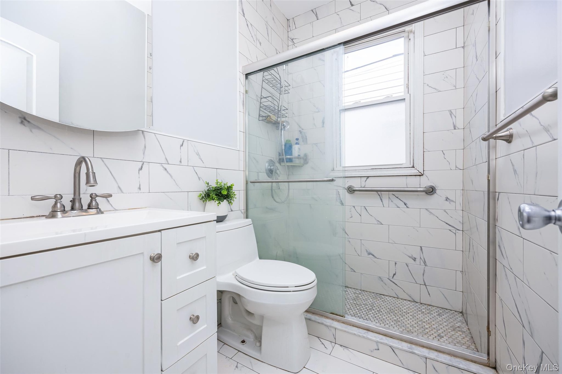 - Full bath with a stall shower, vanity, tile walls, backsplash, and light marble finish floors